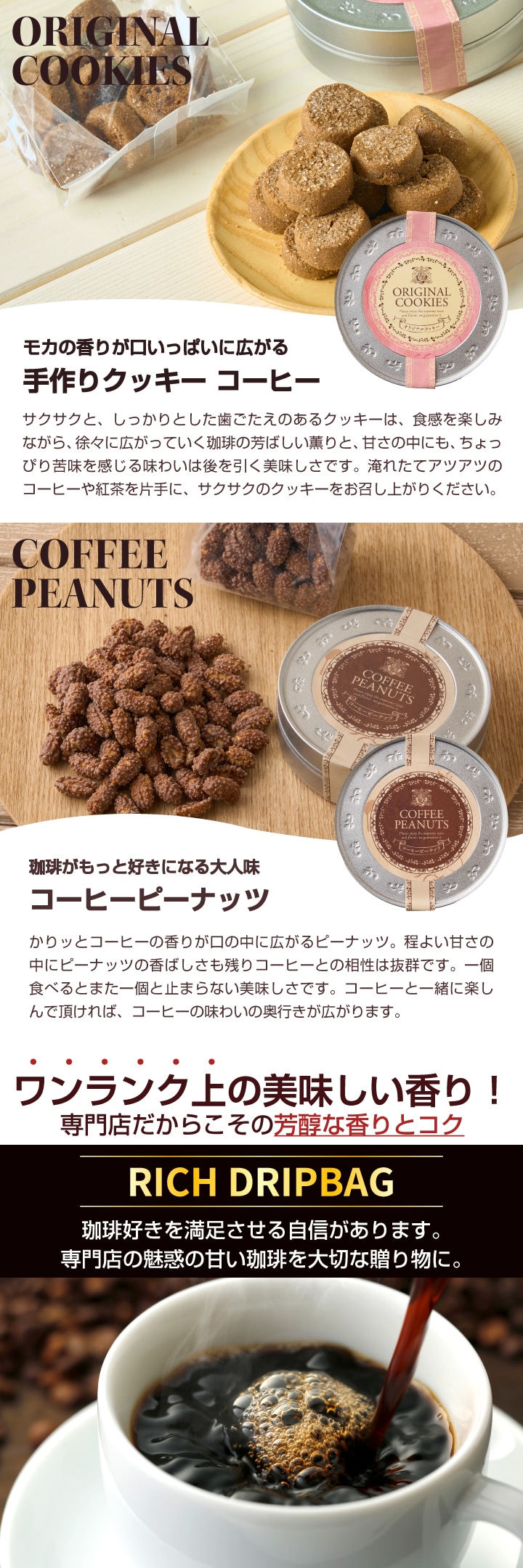 | 保存方法 | 【ドリップバッグコーヒー】高温多湿を避け冷所に保存してください 【クッキー】直射日光、高温多湿を避け25℃以下の涼しい場所で保存してください 【コーヒーピーナッツ】直射日光、高温多湿を避け、冷暗所で保存してください。 |