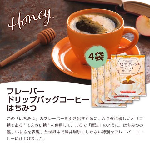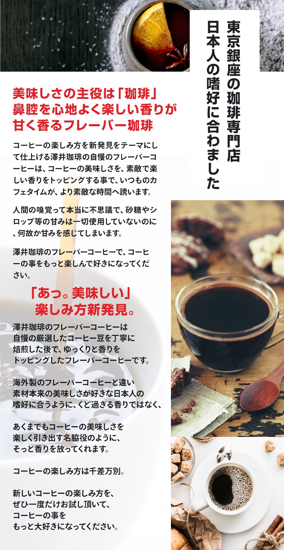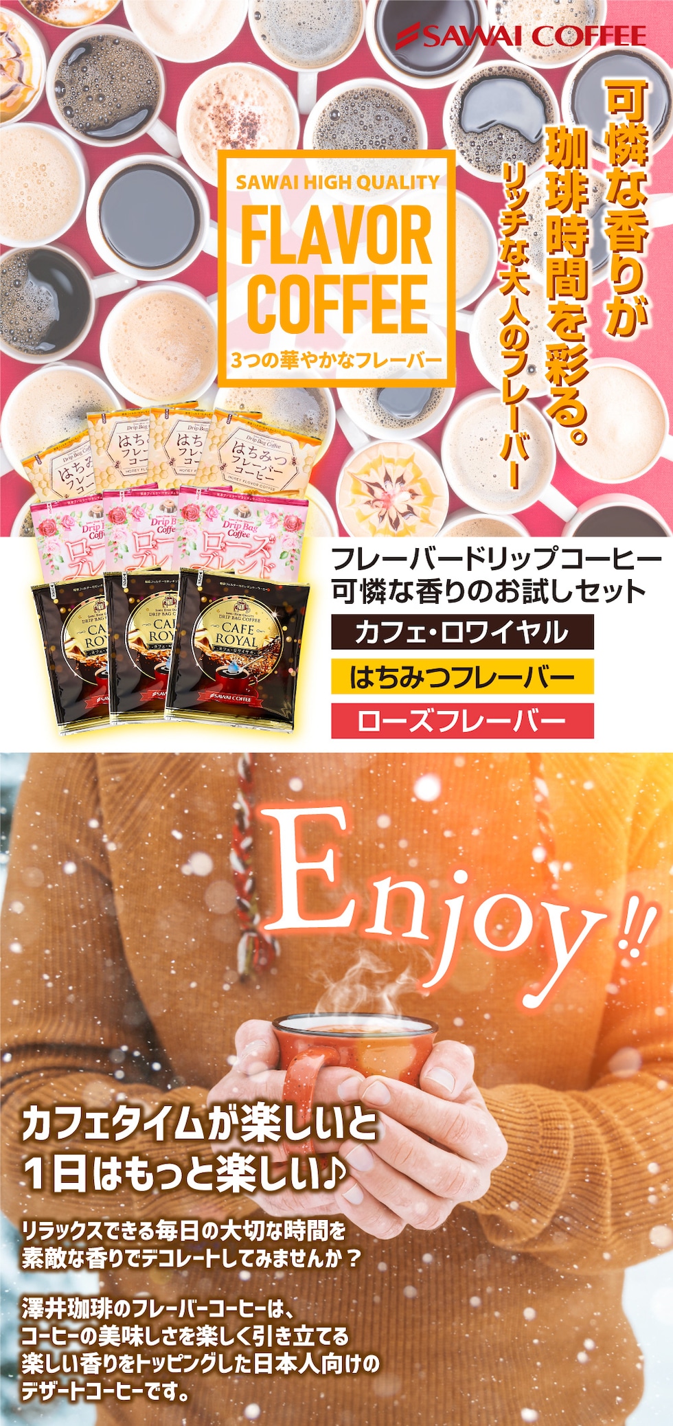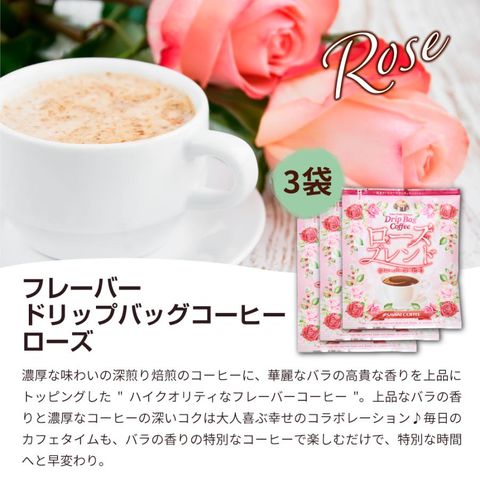 | 澤井珈琲のフレーバードリップコーヒーは、厳選したコーヒー豆にローズやハチミツの香りを加え、香り高いカフェタイムを提供します。カフェロワイヤルの香りもあり、毎日のコーヒー時間を豊かにします。