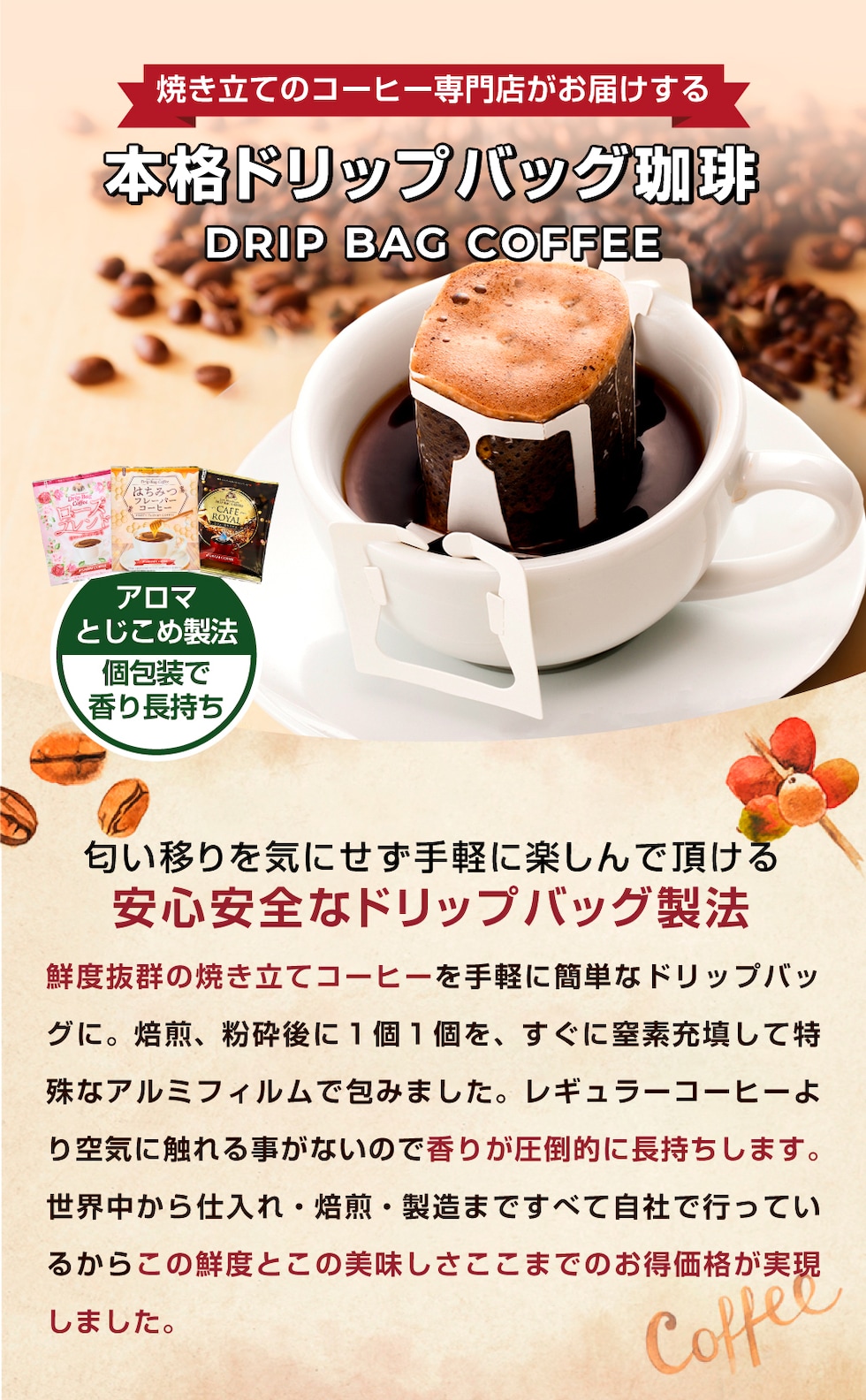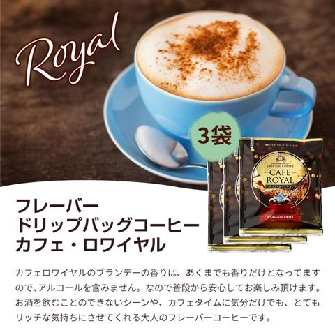 1. 厳選されたコーヒー豆と特別な香りの組み合わせ このコーヒー豆は、丁寧に焙煎されており、その後、特別な香りをトッピングすることで、新しいコーヒーの楽しみ方を提案します。 2. カフェロワイヤルで特別なひとときを 「カフェ・ロワイヤル」は、ブランデーの香りを楽しむことができる大人向けのフレーバードリップコーヒーです。しかし、この香りはアルコールを含んでいないため、アルコールを控えたい方でも安心してお楽しみいただけます。 3. お試しセットで新たなコーヒー体験を ハチミツフレーバーは、体に優しいオリゴ糖「てんさい糖」を使い、やさしい甘さが特徴です。バラのフレーバーは高貴な香りで深いコクのあるコーヒーと絶妙にマッチし、特別なコーヒータイムを演出します。 |