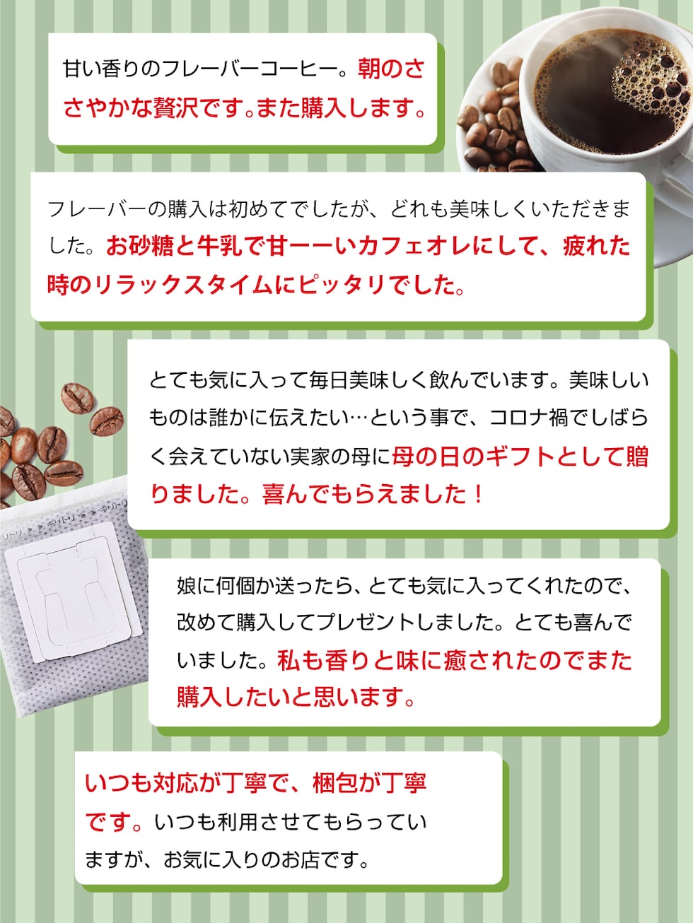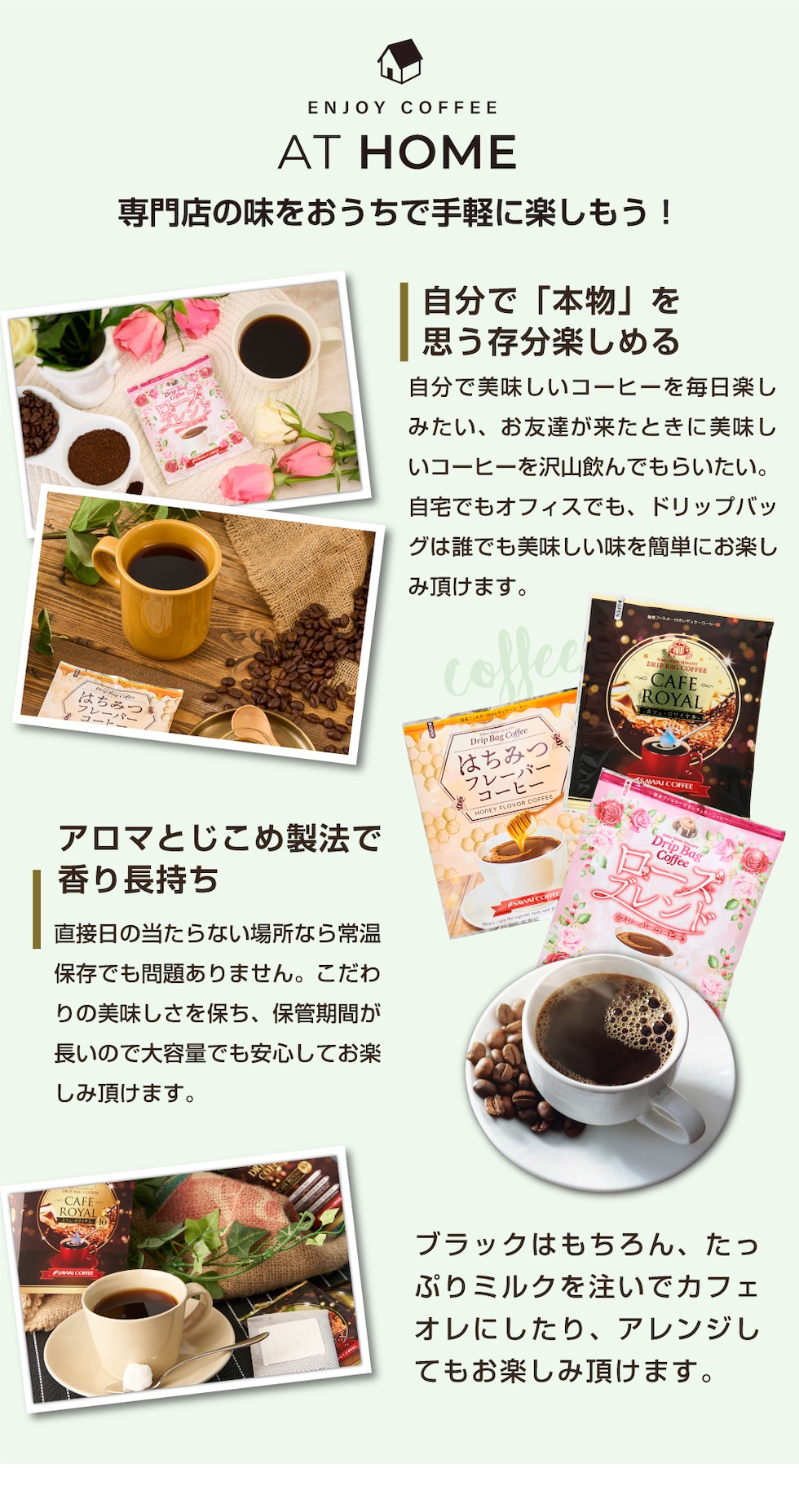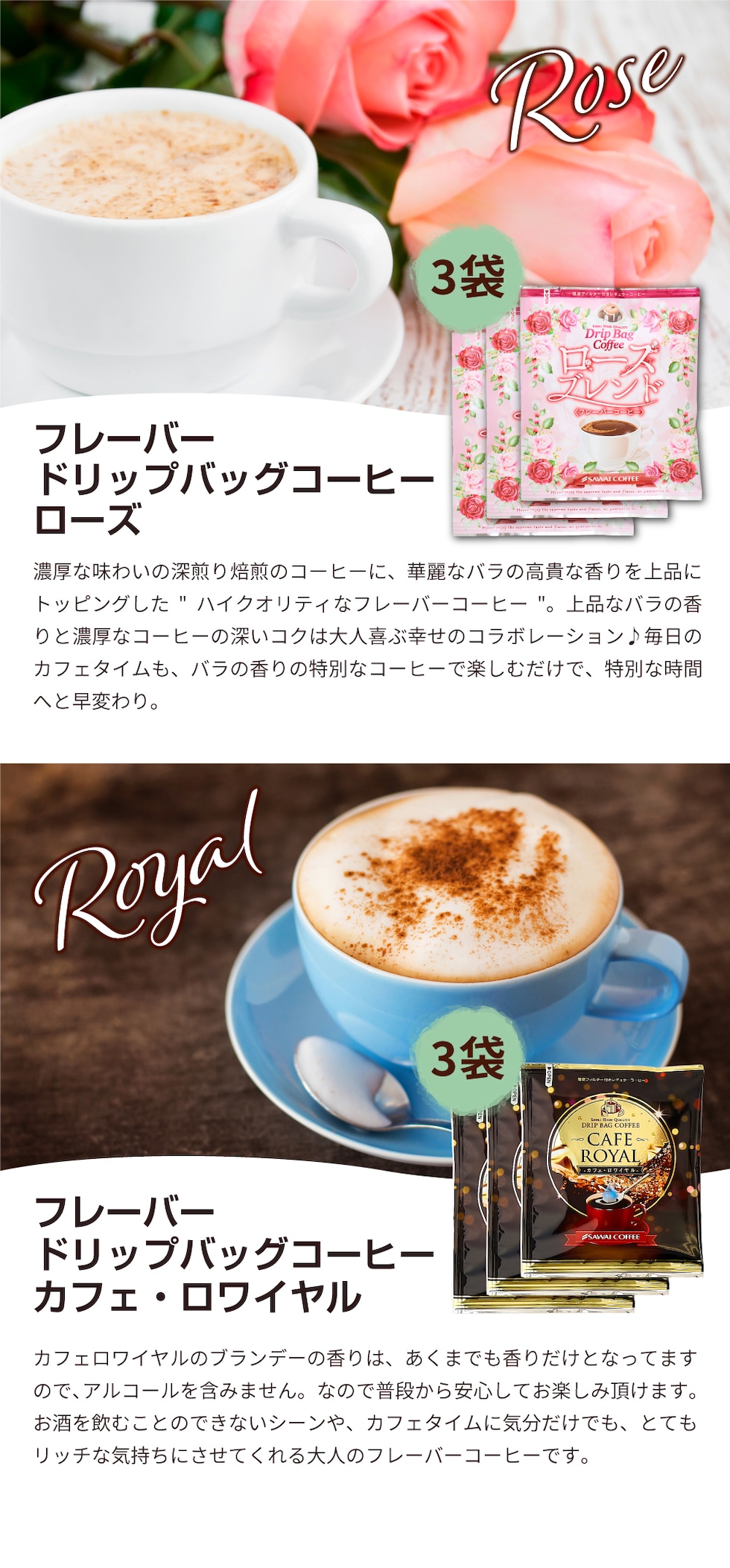 | 内容量 | ・はちみつフレーバーコーヒー 8g×4袋 ・ローズのフレーバーコーヒー 8g×3袋 ・カフェロワイヤル 8g×3袋 |
