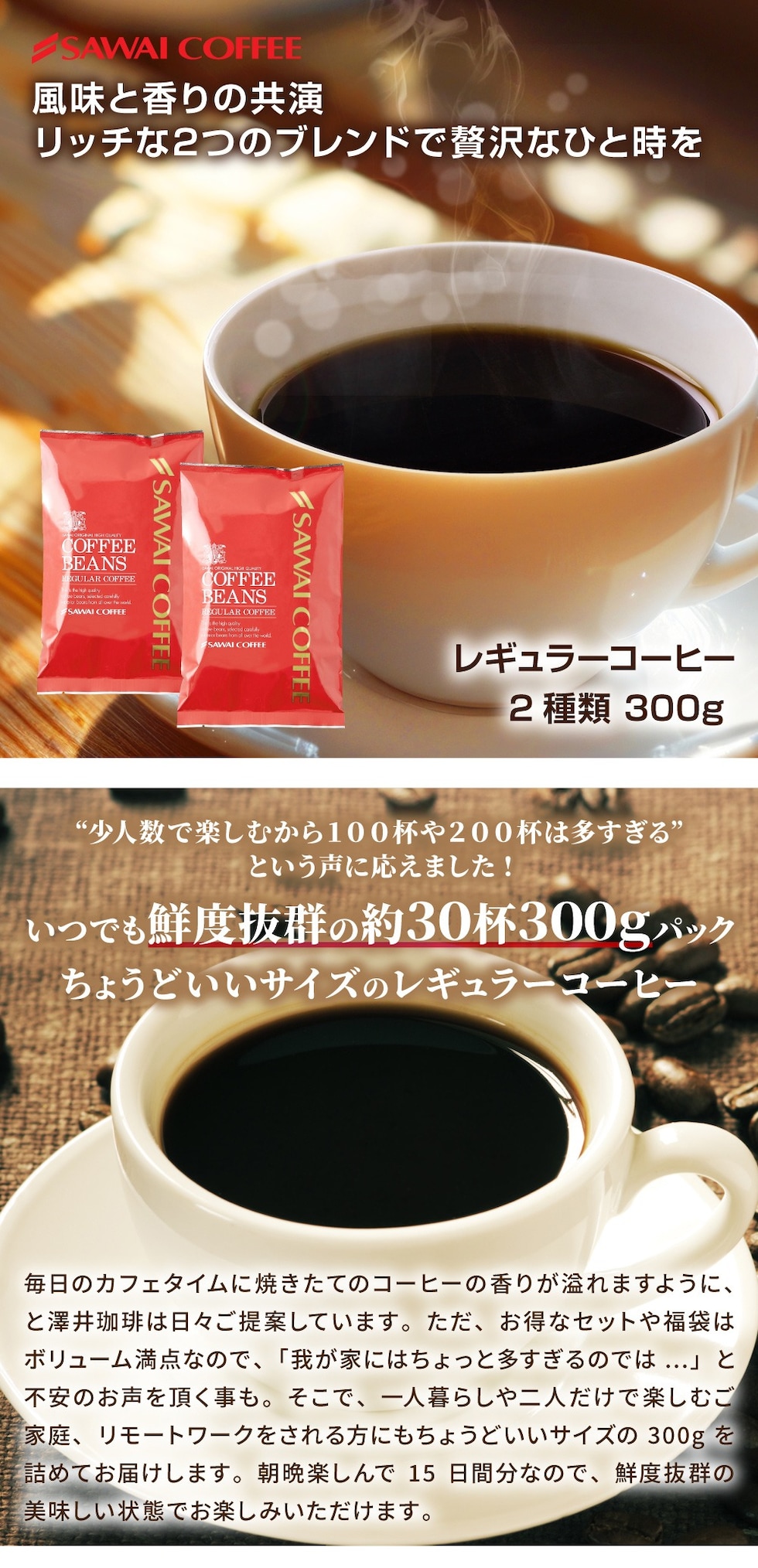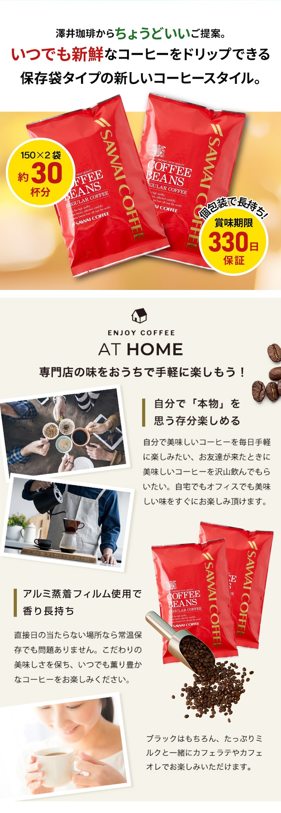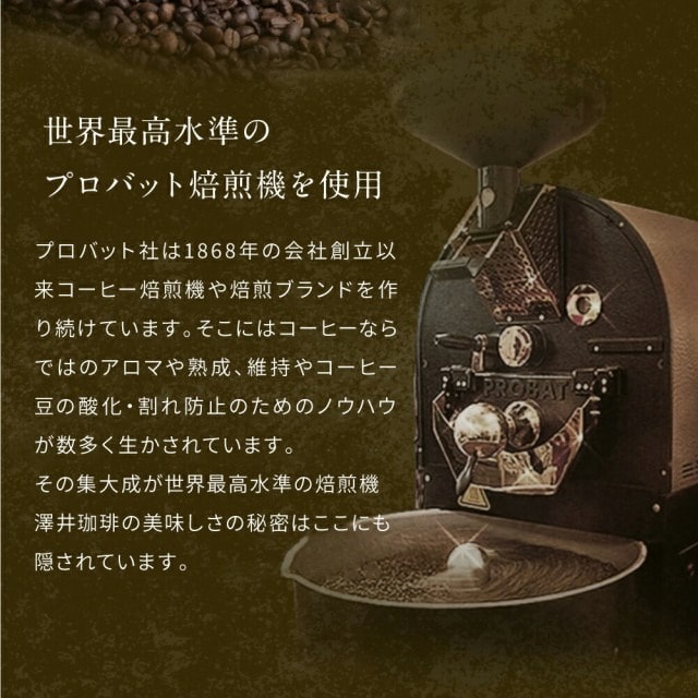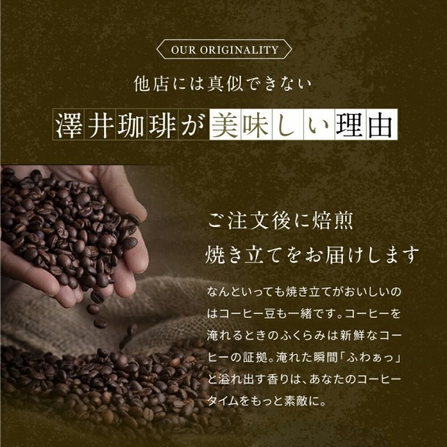 澤井珈琲(さわいこーひー)では、お客様のお家に商品が届き、箱を開けた瞬間。そして、トレードマークの赤いコーヒー袋の封を開けた時に鮮度抜群の「香り高さ」と、飲んだときの「味わい」に感動して頂けるように、レギュラーコーヒーはご注文を頂いてから焙煎をして焼きたてのコーヒー、コーヒー豆、珈琲、珈琲豆をお届けをしている焼き立て珈琲専門店です。お客様に「美味しい」と言って喜んで頂く事が私たちの喜びと思ってます。「美味しいコーヒーをお届けしたい」と想い続けて生まれたこだわりの味を、どうぞ、この機会にお楽しみくださいませ。澤井珈琲では、コーヒー豆は挽き方がご選択いただけます。珈琲豆を挽く事をお楽しみ頂ける『豆のまま』や、私共の専用の特注サイズの大型のミルで挽いて、コーヒー粉の状態にしてお届けする方法がございます。中挽き、細挽き、粗挽き、荒挽きなど様々な挽き方がございますが、私共がお薦めする『店長のおすすめ挽き』にて、そのコーヒーに合った一番美味しいと思える挽き方に挽いてお届けします。東京の銀座にも実店舗を構え、都内では浅草やスカイツリーのあるソラマチにも出店。「鳥取のコーヒー屋さん」とも呼ばれてますが、空気が綺麗で自然豊かな鳥取県に焙煎工場を構え、隣接する島根県の松江市や出雲市にも実店舗がございます。顔の見えないネット通販ですが、全国11店舗を展開する安心安全な澤井珈琲は、特徴的な「赤いコーヒー袋」に入れて、全国の珈琲好きにお選び頂いてます。よく間違えられる名前として、沢井珈琲、沢井コーヒー、澤井珈琲店、澤井珈琲本店、さわいこーひー、サワイコーヒーなどがございますが、正式名称は澤井珈琲となります。