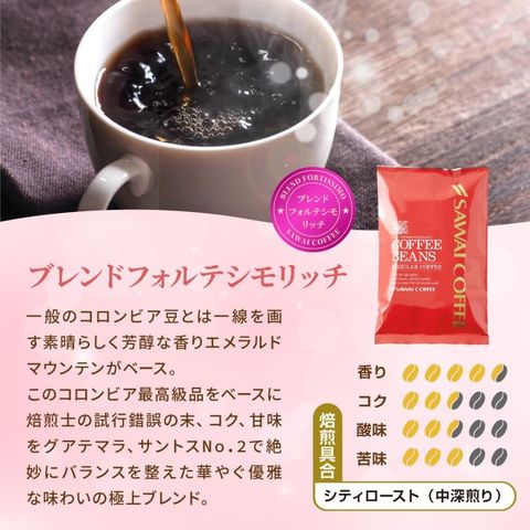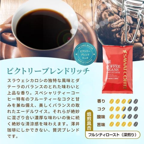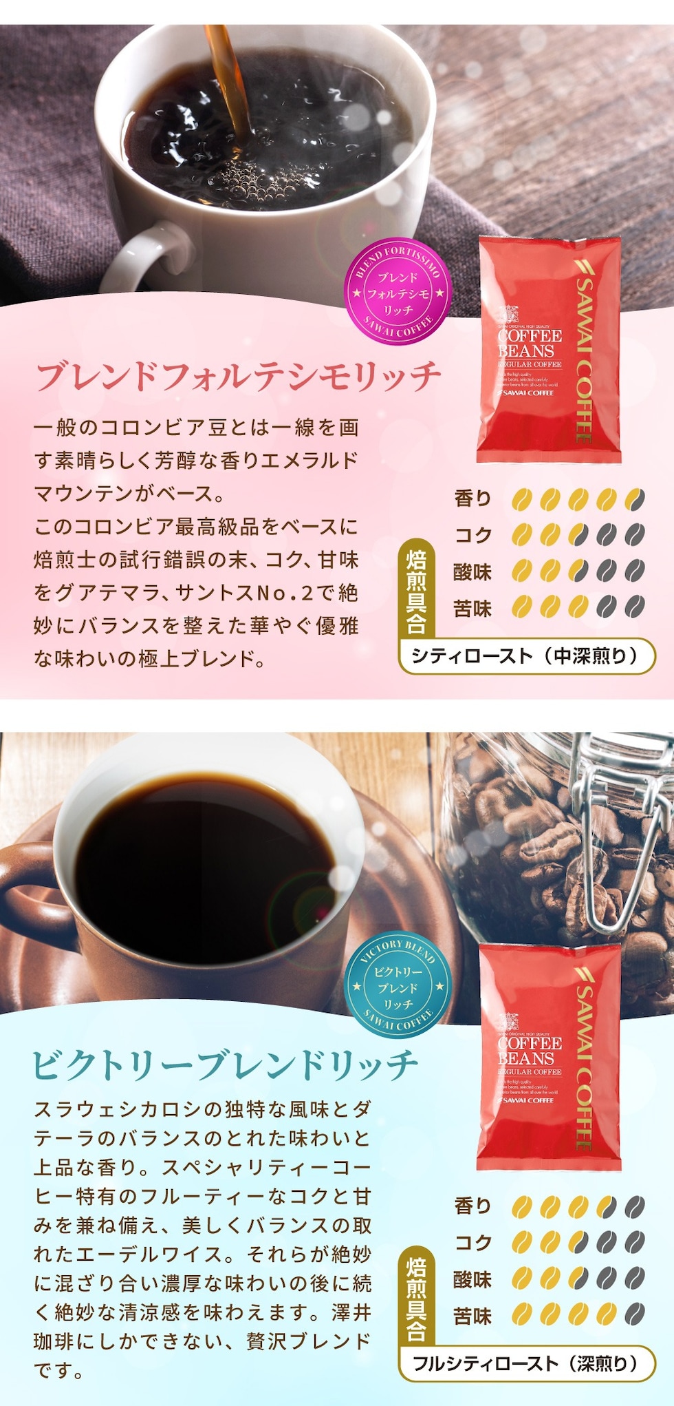 「ブレンドフォルテシモリッチ」は、エメラルドマウンテンをベースに、コロンビア豆の芳醇な香りと優雅なコクが特徴。「ビクトリーブレンドリッチ」は、フルーティーな甘みと深みが調和した、エレガントな味わいが楽しめます。それぞれ異なる風味を持っているので、是非飲み比べてお楽しみください。