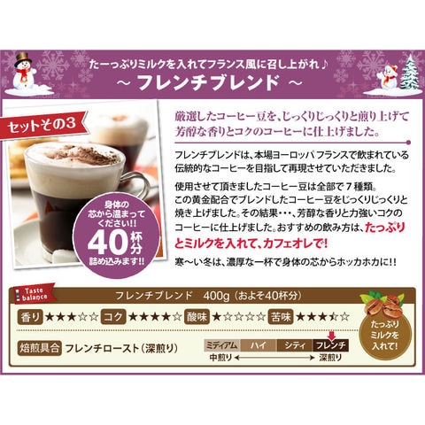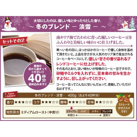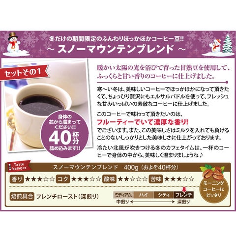 ・スノーマウンテンブレンド 400g×1袋 ・冬のブレンド-淡雪- 400g×1袋 ・フレンチブレンド 400g×1袋 ・キャラメルシフォン(12cm)×1個 |