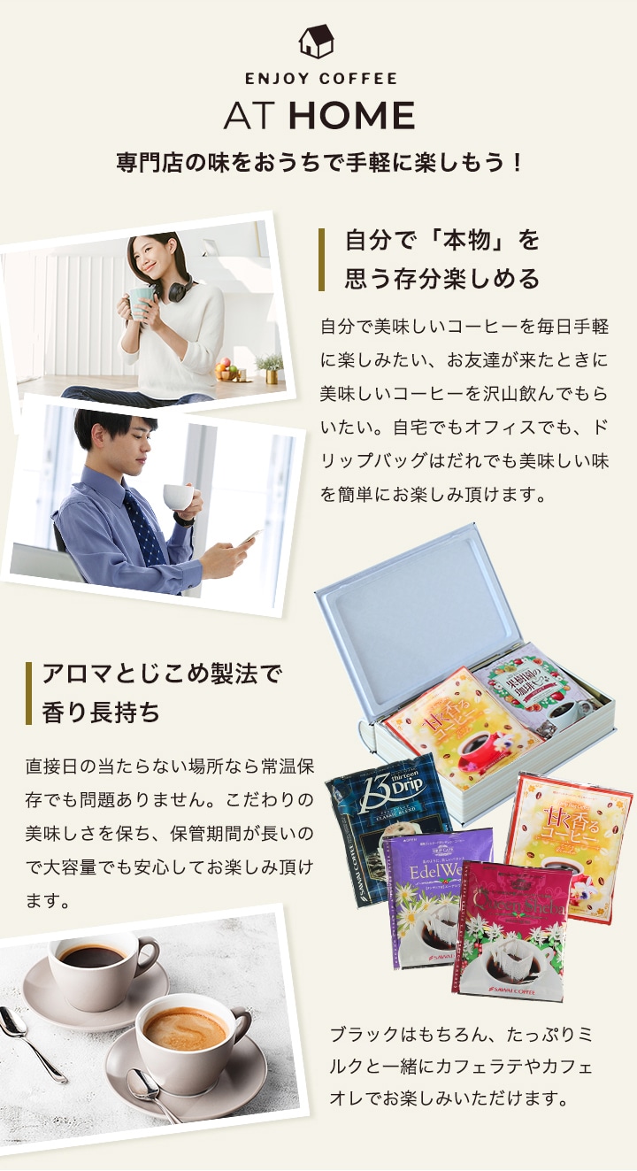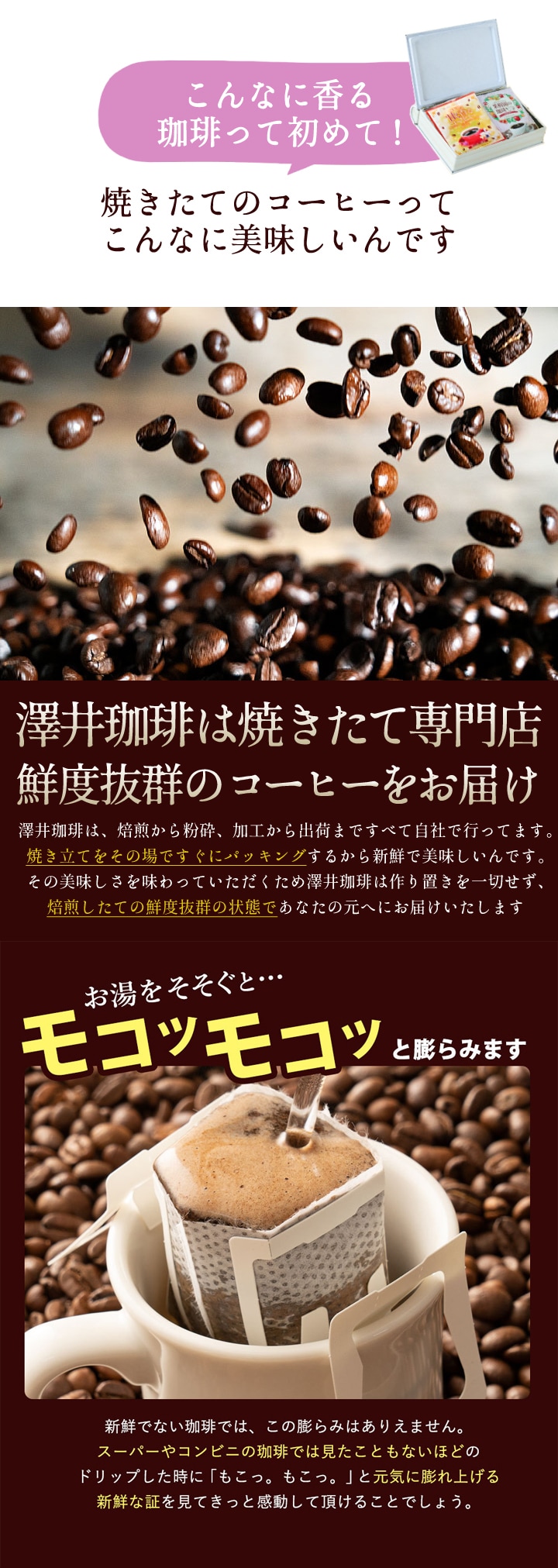 | 澤井珈琲のHeartfelt Coffee GIFTは、特別な人に贈るために作られた、素敵な香りと味わいが詰まったコーヒーギフトです。美しいブック型缶ケースに入れられたスペシャリティーコーヒーで、大切な人を笑顔にします。 1. 贈り物にぴったりの美しいブック型缶ケース Heartfelt Coffee GIFTは、美しいアンティーク調のブック型缶ケースに入っています。この缶ケースは、見た目もおしゃれで、大切な人への贈り物として最適です。プレゼントを開けた瞬間に広がる華やかなデザインと香りは、受け取った人に特別な気持ちを伝えます。この缶は、後で小物入れやインテリアとしても使えるため、贈った後も長く喜ばれることでしょう。シンプルでありながら心のこもった贈り物を探している方にぴったりです。 2. 世界中から選び抜かれたスペシャリティーコーヒー このギフトセットには、世界中から厳選されたスペシャリティーコーヒーが含まれています。澤井珈琲のプロが選んだコーヒーは、香りや味わいがまるで宝石のように大切に扱われています。たとえば、コロンビアのコーヒーはフルーティーな味わいが特徴で、まるで果物を食べているような新鮮な体験ができます。また、甘く香るコーヒー ビーニョは、コーヒー王国ブラジル産の、口に含んだ瞬間に際立つ甘さとワインを想わせるフレーバーが魅力で、すっきりとした後味まで美しく調和した味わいをお楽しみいただけます。これらのコーヒーは、コーヒー好きな方にとってはたまらない一品です。 3. 特別な瞬間を彩るプレミアムな香りと味わい Heartfelt Coffee GIFTは、贈る相手に特別な瞬間を提供します。澤井珈琲が自信を持って提供するこのコーヒーは、新鮮さにこだわり、贈られた人が一口飲むたびにその香りと味わいに感動することでしょう。甘く華やかな香りと奥行きのある味わいは、忙しい日常の中でほっと一息つける時間を提供し、心の安らぎを与えてくれます。このギフトは、感謝や愛情を伝えるのに最適で、贈られた人の笑顔を引き出すこと間違いなしです。 |