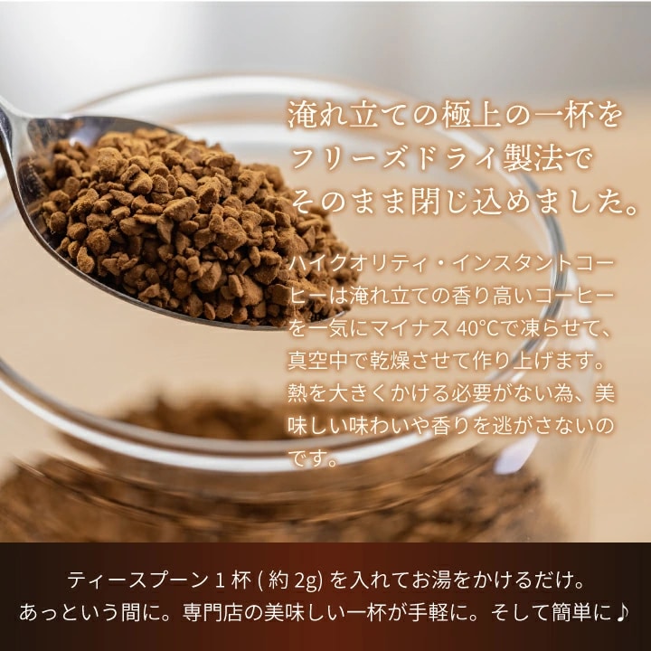 | 澤井珈琲のハイクオリティ・インスタントコーヒーは、香り高く濃厚な味わいをフリーズドライ製法でそのまま閉じ込めた、手軽に楽しめるインスタントコーヒーです。どんな忙しい日でも、簡単に専門店のコーヒーの美味しさをお届けします。 1.濃厚な味わいと香り 澤井珈琲のハイクオリティ・インスタントコーヒーは、フリーズドライ製法で香り高いコーヒーを一気にマイナス40℃で凍らせ、真空中で乾燥させて作り上げています。この特別な製法により、熱を大きくかける必要がなく、美味しい味わいや香りを逃がさずに閉じ込めることができます。結果として、カップにお湯を注ぐだけで、溢れ立つ香りと濃厚な味わいを楽しむことができます。手軽でありながら、専門店の品質を感じることができるインスタントコーヒーです。 2.手軽に楽しめる高品質コーヒー 忙しい毎日でも、澤井珈琲のハイクオリティ・インスタントコーヒーなら、簡単に美味しいコーヒーを楽しむことができます。ティースプーン1杯(約2g)をカップに入れ、お湯を注ぐだけで、専門店の味と香りが広がります。特別な道具や手間をかけることなく、本格的なコーヒータイムを過ごせるのが、この商品の大きな魅力です。忙しい朝やリラックスしたい夜など、いつでもどこでも手軽に楽しめる一杯です。 3.選べる2つのラベル 澤井珈琲のハイクオリティ・インスタントコーヒーには、異なる味わいを楽しめる赤ラベルと黒ラベルがあります。赤ラベルは、優しい口当たりと柔らかいフルーティーな甘みが特長で、心地よい香り高さも楽しめる上品なコーヒーです。一方、黒ラベルは、深い味わいとコク、程よい苦みを楽しめるビターなコーヒーで、濃厚な苦みが特長です。どちらのラベルも、約75杯分とたっぷり楽しめる量が入っており、その日の気分やシーンに合わせて選ぶことができます。 |