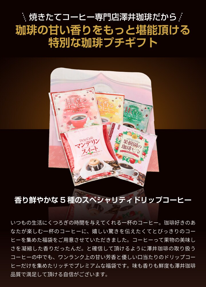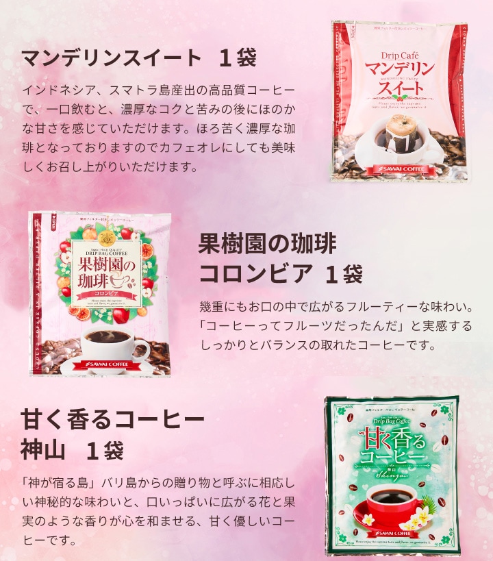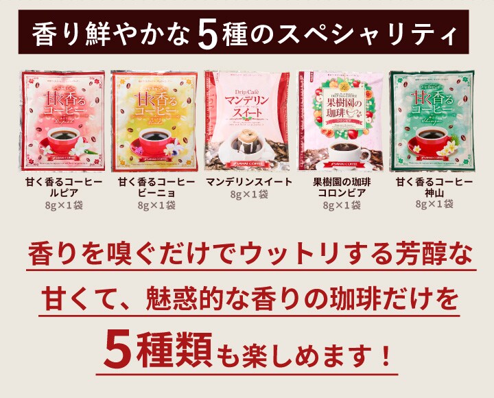 | 内容量 | ・甘く香るコーヒー ルピア 8g×1袋 ・甘く香るコーヒー ビーニョ 8g×1袋 ・甘く香るコーヒー 神山 8g×1袋 ・マンデリンスイート 8g×1袋 ・果樹園の珈琲 コロンビア 8g×1袋 |