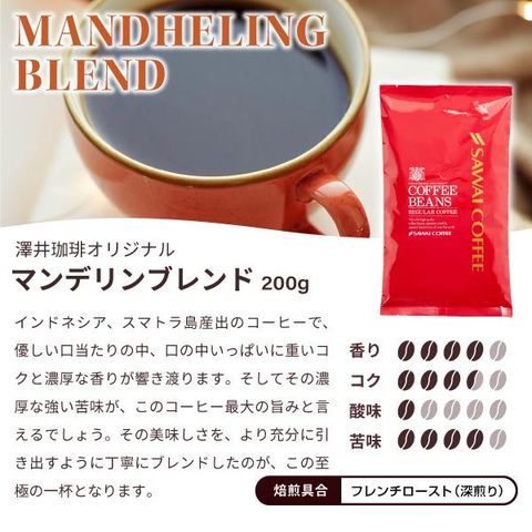 | 澤井珈琲の「マンデリンブレンド200g」は、インドネシア・スマトラ島産の豆を使用した、濃厚なコクと香りが特徴の深煎りコーヒーです。鮮度抜群の状態で、ちょうどいいサイズの200gパックに詰められ、毎日のコーヒータイムを豊かに彩ります。長期間保存が可能で、いつでも新鮮な味わいを楽しめます。