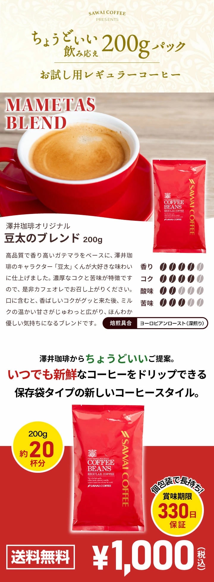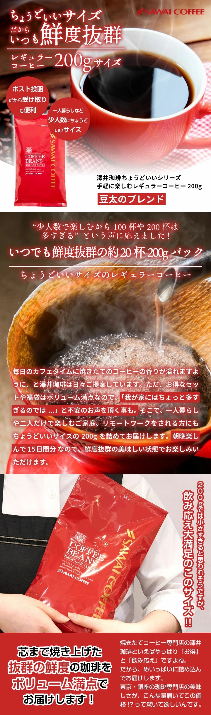 焙煎したて コーヒー豆 コーヒー粉【中挽き】 1000円ポッキリ 送料無料 メール便 澤井珈琲 少量お試し 【飲みきりサイズ レギュラーコーヒー 豆太のブレンド】 約20杯 1000円プレゼント
