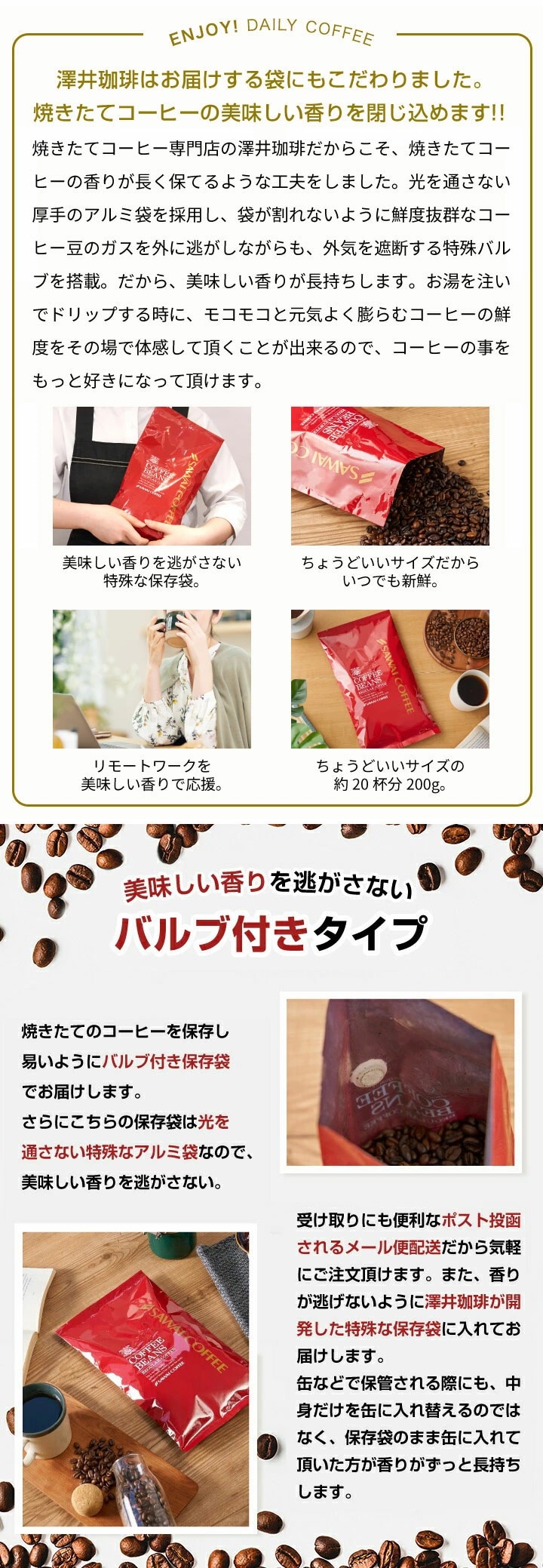 澤井珈琲の豆太のブレンドは、高品質な珈琲豆をベースにした濃厚なコクと苦味が特徴のコーヒーです。200gで約20杯分、いつでも新鮮なコーヒーを楽しめます。少人数にぴったりのサイズで、便利なポスト投函のゆうメール便でお届けします。 1. 高品質な珈琲豆の豊かな香り 豆太のブレンドは、高品質なコーヒー豆を使用しています。豊かな香りと濃厚なコク、しっかりとした苦味が特徴です。コーヒーを淹れる際に広がる香りは、毎日のカフェタイムを特別なものにしてくれます。特にカフェオレにすると、ミルクの甘さと相まってさらに美味しさが引き立ちます。自宅で本格的なカフェの味わいを楽しみたい方におすすめです。 2. 新鮮さを保つ保存袋でいつでも美味しい 澤井珈琲の豆太のブレンドは、200gのちょうどいいサイズで提供されます。保存袋タイプなので、新鮮さを保ちながら最後の一杯まで美味しく飲むことができます。約20杯分の容量は、一人暮らしや少人数の家庭に最適です。ポスト投函が可能で、受け取りも便利です。忙しい毎日でも、簡単に新鮮なコーヒーを楽しむことができるのが魅力です。 3. 少人数にぴったりのサイズと利便性 豆太のブレンドは、100杯や200杯では多すぎるという声に応えて作られました。200gというちょうどいいサイズは、一人暮らしや少人数の家庭、リモートワーク中のリフレッシュタイムにぴったりです。澤井珈琲は、毎日のカフェタイムを豊かにするために、このサイズを提案しています。朝晩楽しんで約15日間、新鮮で美味しいコーヒーを楽しむことができます。手軽に本格的なコーヒーを楽しみたい方におすすめです。 |