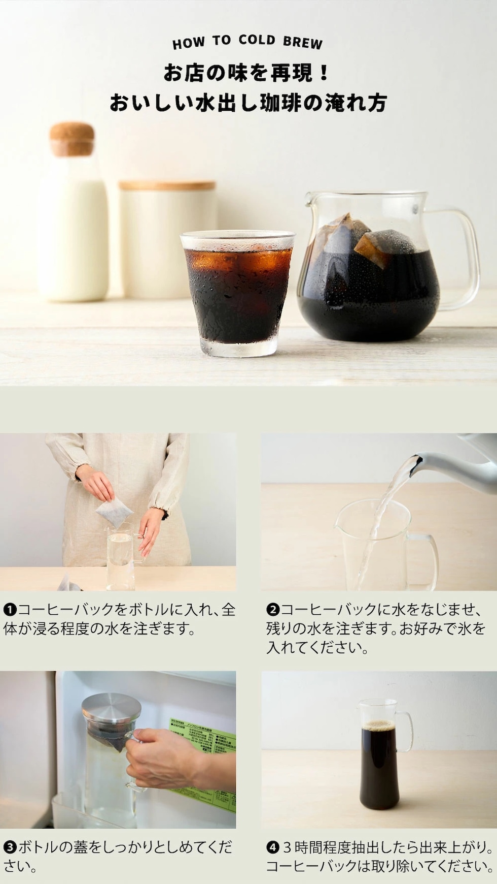 | こんな方にオススメです | 自宅で簡単に本格的な水出しコーヒーを楽しみたい方: 特別な器具がなくても、パックを水に入れるだけで簡単に美味しいコーヒーができるので、自宅でカフェのような体験を求める方にぴったりです。 夏場に冷たいアイスコーヒーを手軽に飲みたい方: 冷蔵庫に入れておくだけで、いつでもスッキリとしたアイスコーヒーを飲むことができるので、暑い季節に最適です。 個包装になっているため、持ち運びが便利で、どこでも新鮮なコーヒーを楽しむことができます。 |