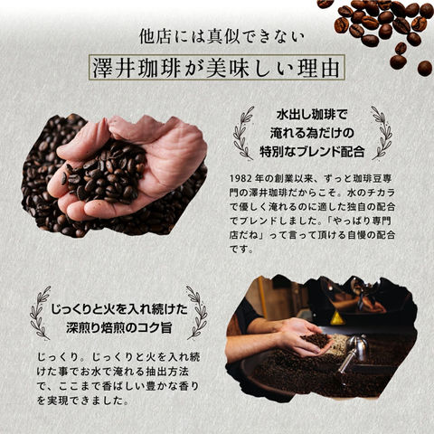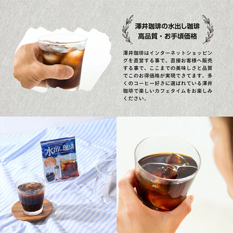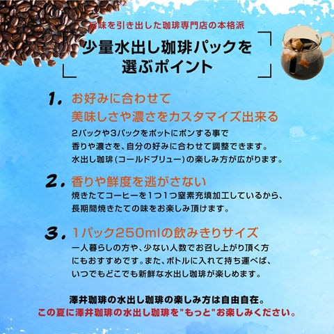 | 澤井珈琲の水出し珈琲は、手軽に美味しいコーヒーを楽しめるカスタマイズ可能な飲みきりサイズのパックで、香りや鮮度を保ちながらお手頃価格で提供しています。 1. お好みに合わせて美味しさをカスタマイズできる 自分の好みに合わせて美味しさや濃さを簡単に調整できるのが大きな特徴です。2パックや3パックをポットに入れるだけで、自分の好きな濃さに仕上げることができます。 2. 香りや鮮度を逃がさない 焙煎したてのコーヒー豆を1つ1つ窒素充填加工しているため、香りや鮮度を長期間保つことができます。これにより、いつでも新鮮な味わいのコーヒーを楽しむことができます。 3. 1パック250mlの飲みきりサイズ 1パックで250mlの飲みきりサイズとなっており、一人暮らしの方や少人数の家庭に最適です。このサイズは、一度に飲みきれる量なので、いつでも新鮮なコーヒーを楽しむことができます。 |