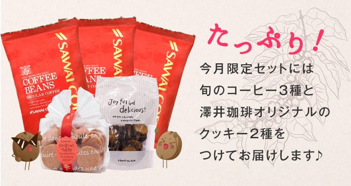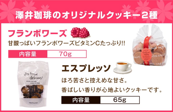 | 内容量 | ・スプリングブレンド×200g ・エクセレントブレンド×200g ・ゴールデンモカ×200g ・オリジナルクッキー フランボワーズ 70g×1袋 ・オリジナルクッキー エスプレッソ 65g×1袋 |
