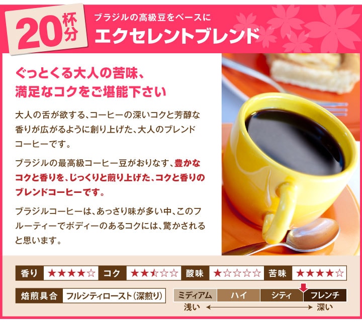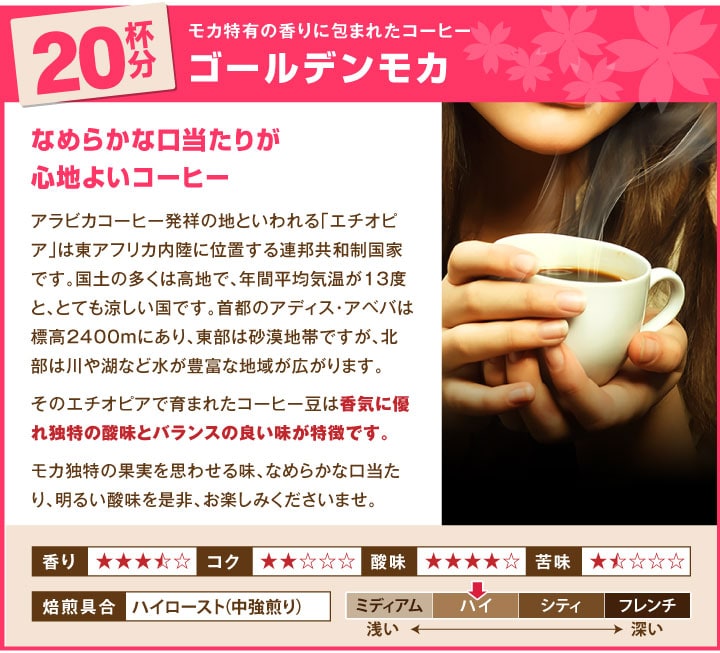 | 産地 | 【スプリングブレンド】ブラジル、エチオピア 【エクセレントブレンド】ブラジル他 【ゴールデンモカ】エチオピア |