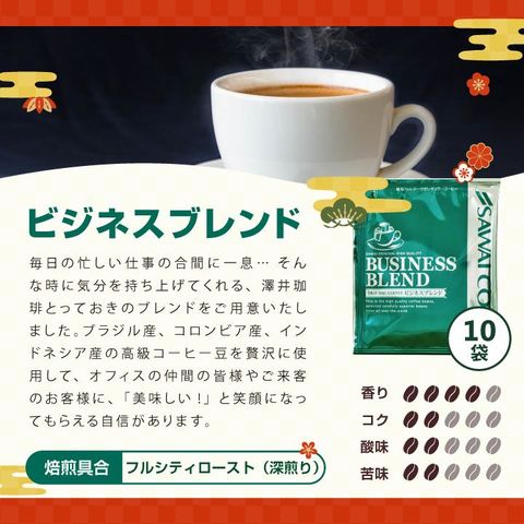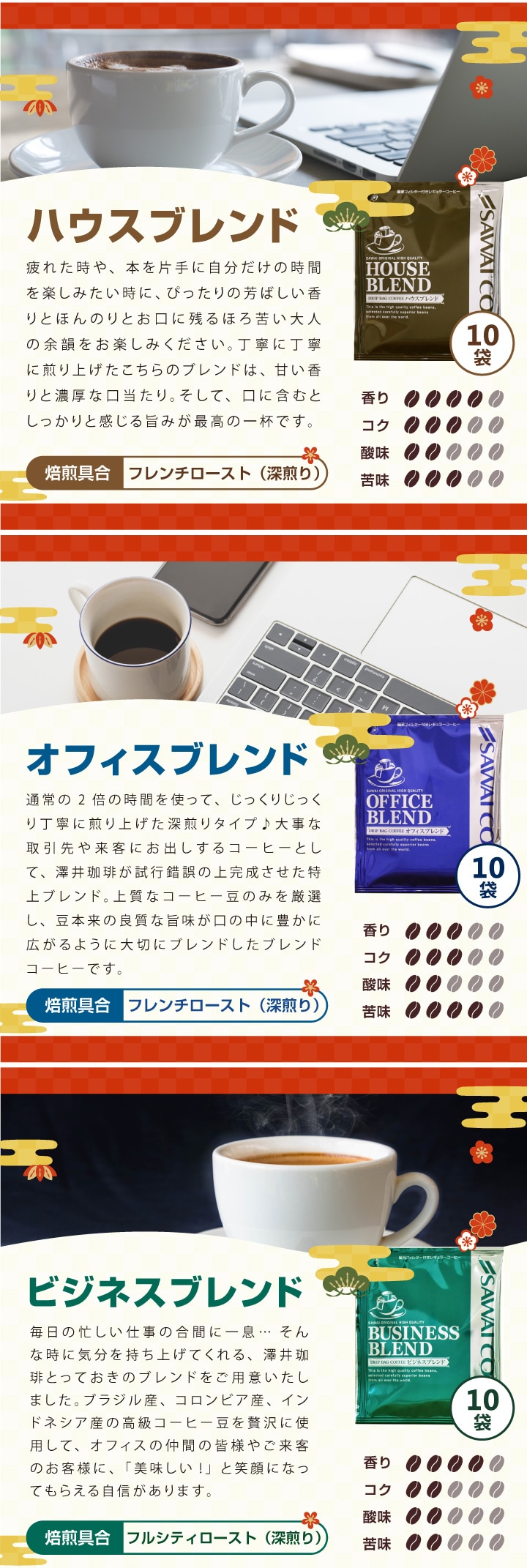 ドリップバッグコーヒー ・ハウスブレンド 7g×10袋 ・オフィスブレンド 7g×10袋 ・ビジネスブレンド 7g×10袋 ・プレミアムゴールド 8g×2袋 |