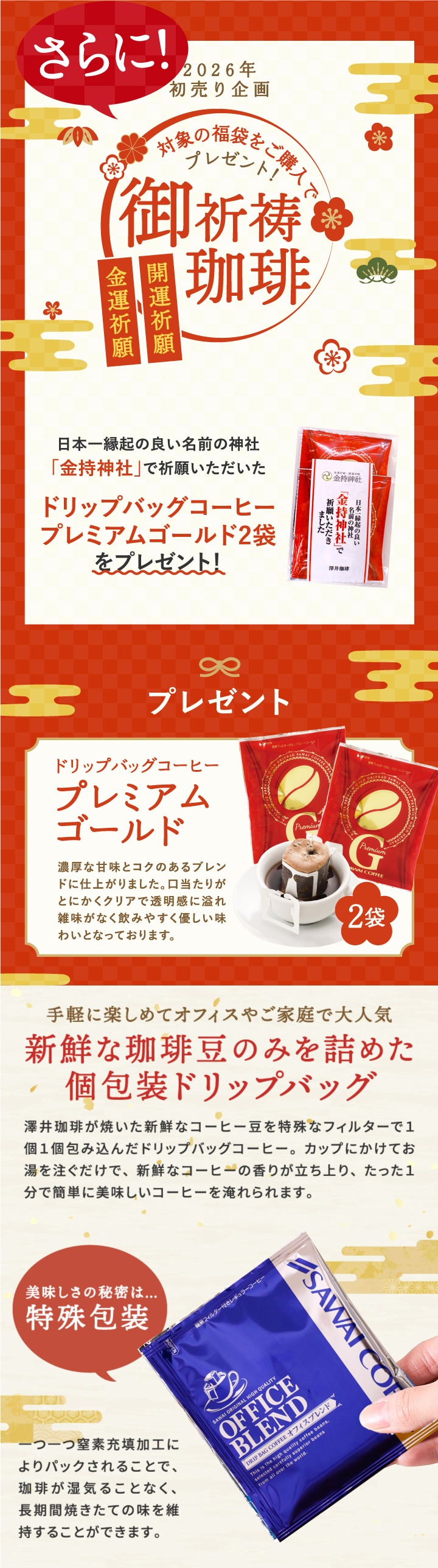 送料無料 ドリップバッグ コーヒー 珈琲 "深煎りで迎える新年" 澤井珈琲 初売り ドリップパック ドリップコーヒー 7g×30袋 8g×2袋 ハウス ビジネス オフィス プレミアムゴールド 香ばしい風味 祈願付き 福袋