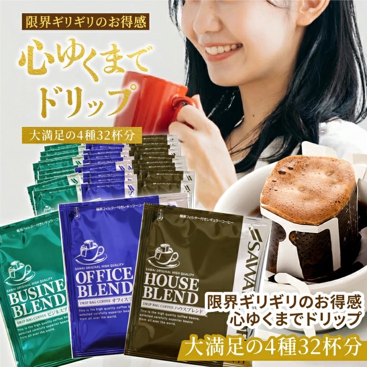 福袋 送料無料 ドリップバッグ コーヒー 珈琲 深煎り 飲み比べ 32袋 澤井珈琲 ドリップパック 個包装 大容量 セット ハウス オフィス ビジネス プレミアムゴールド ギフト 自宅用 業務用 ドリップコーヒー
