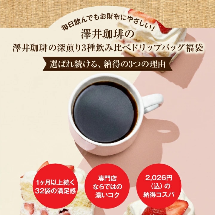 深煎りの香ばしさを3種類で飲み比べ。たっぷり32袋入りで、毎日の一杯が楽しみになるお財布にやさしい福袋セットです。