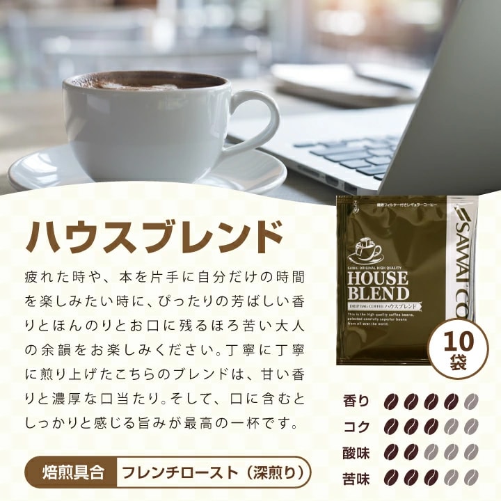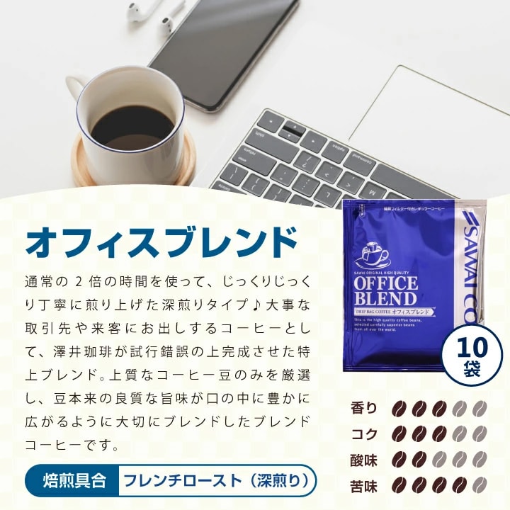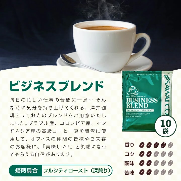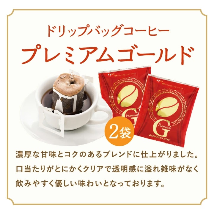 ドリップバッグコーヒー ・ハウスブレンド 7g×10袋 ・オフィスブレンド 7g×10袋 ・ビジネスブレンド 7g×10袋 ・プレミアムゴールド 8g×2袋 |