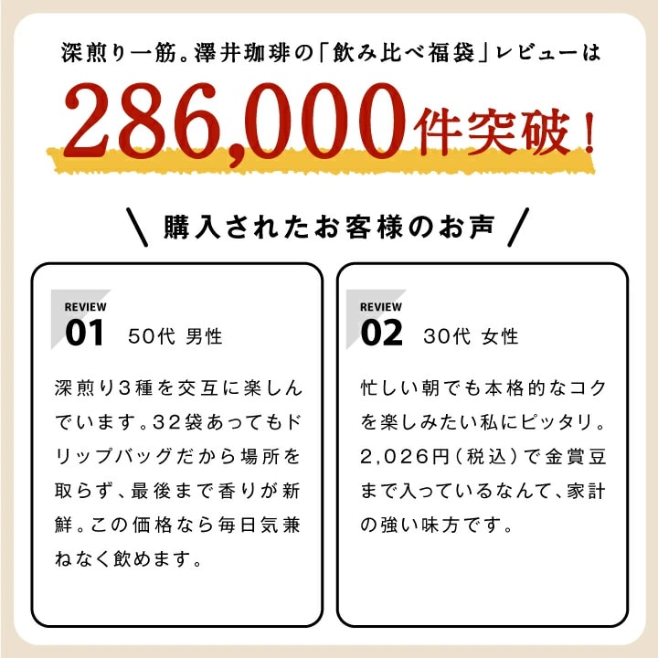 286,000件突破の大人気福袋!深煎り3種飲み比べで毎日違う味を