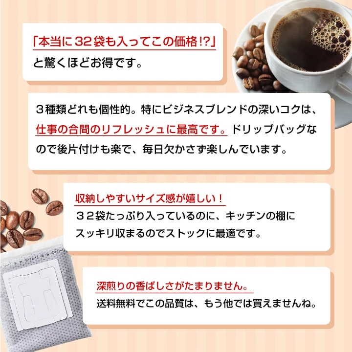 32袋入りでこの価格!深煎り3種の本格コクと香ばしさ