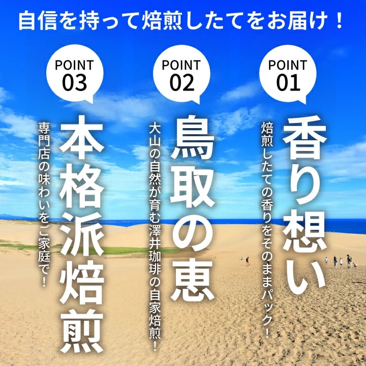 深煎りの豊かな香りとコク。世界各国から選び抜いた珈琲豆を鳥取で丁寧に焙煎し、本格派の味わいをご家庭で手軽にお楽しみいただけます。