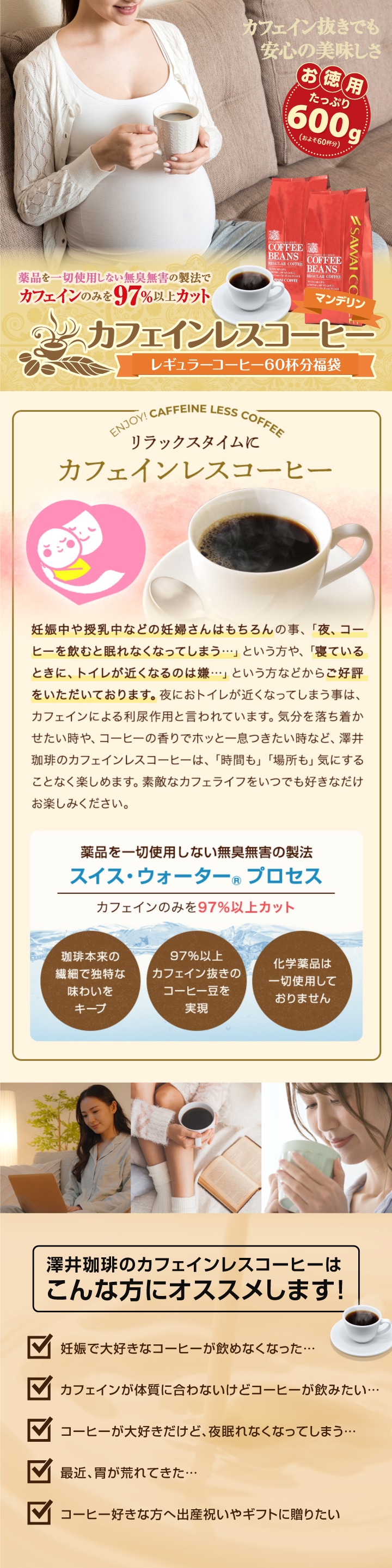 | 商品特徴 | 毎日楽しむ、自分だけの大切な時間。それが、美味しいコーヒータイム。そんなときは、澤井珈琲のコーヒーがお薦めです。美味しさはそのままに、香りがふわぁぁって、立ち上る美味しいコーヒーお楽しみいただけます。■ コーヒーが大好きだけど…。夜、眠れなくなっちゃう人へ。□ カフェインが体質に合わなくって…。って人へ■ 赤ちゃんが出来て、大好きなコーヒーが飲めなくなっちゃった人へ。□ 最近、肝臓が悪くって…。最近、胃が荒れてきて…。って人へ。 当店のカフェインレスは、水の力を使ってカフェインのみを97%カットしてあります。また、無臭無害ですので、コーヒーの本来の味と薫りはそのままに。カフェインだけがない美味しいコーヒーとなっております。 |