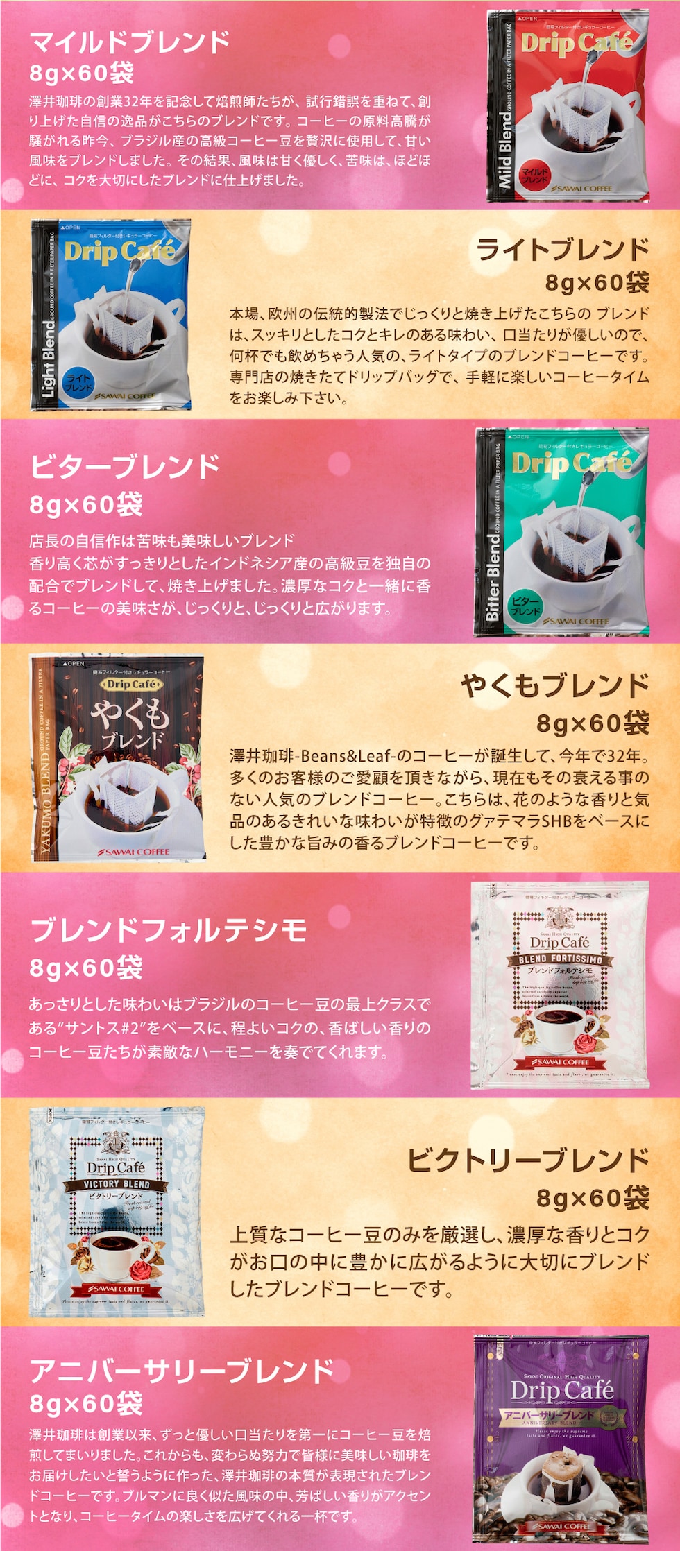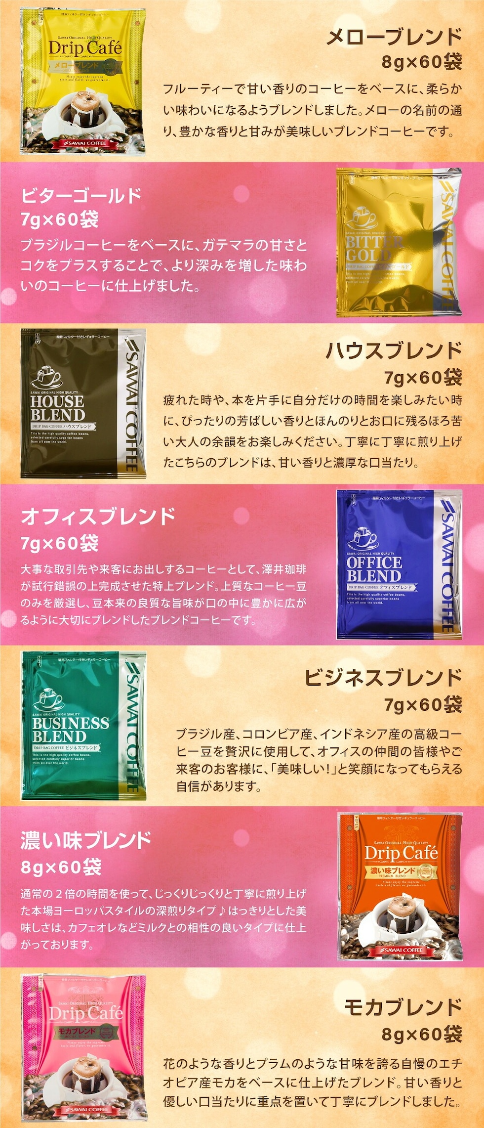 ●ドリップバッグ ・マイルドブレンド 8g×60袋 ・ライトブレンド 8g×60袋 ・ビターブレンド 8g×60袋 ・やくもブレンド 8g×60袋 ・ブレンドフォルテシモ 8g×60袋 ・ビクトリーブレンド 8g×60袋 ・アニバーサリーブレンド 8g×60袋 ・ガテマラデリシャス 8g×60袋 ・ビターゴールド 7g×60袋 ・ハウスブレンド 7g×60袋 ・オフィスブレンド 7g×60袋 ・ビジネスブレンド 7g×60袋 ・濃い味ブレンド 8g×60袋 ・モカブレンド 8g×60袋 ●開運干支飴 1袋(2本入) |