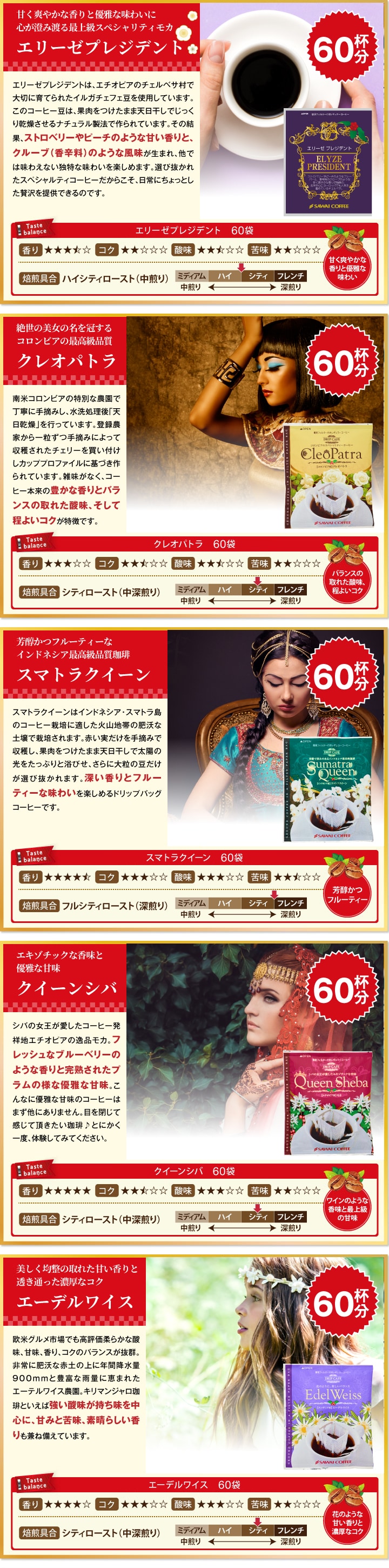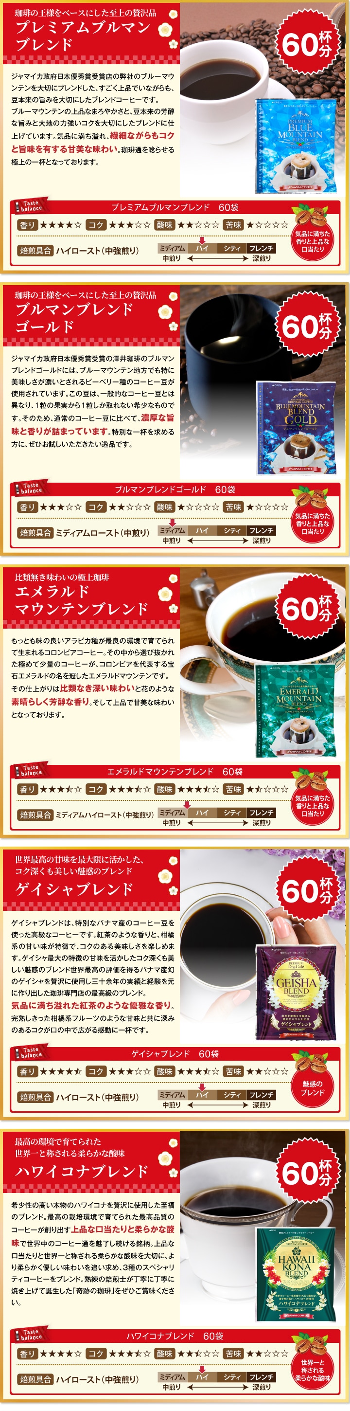 ●ドリップバッグ ・ブルーマウンテンNo.1ブレンド 8g×60袋 ・プレミアムゴールド 8g×60袋 ・13Drip 紅のブレンド 13g×60袋 ・13Drip 白のブレンド 13g×60袋 ・プレミアムブルマンブレンド 8g×60袋 ・ブルマンブレンドゴールド 8g×60袋 ・エメラルドマウンテンブレンド 8g×60袋 ・ゲイシャブレンド 8g×60袋 ・ハワイコナブレンド 8g×60袋 ・エリーゼプレジデント 8g×60袋 ・クレオパトラ 8g×60袋 ・スマトラクイーン 8g×60袋 ・クイーンシバ 8g×60袋 ・エーデルワイス 8g×60袋 ●開運干支飴 2本×1袋 |