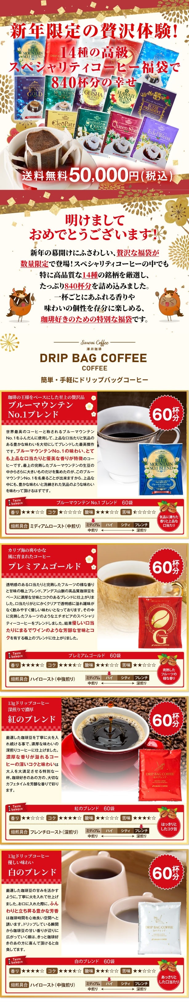 | 商品名 | 初売りセール限定 スペシャリティーコーヒー ドリップバッグ14種840杯福袋 |
