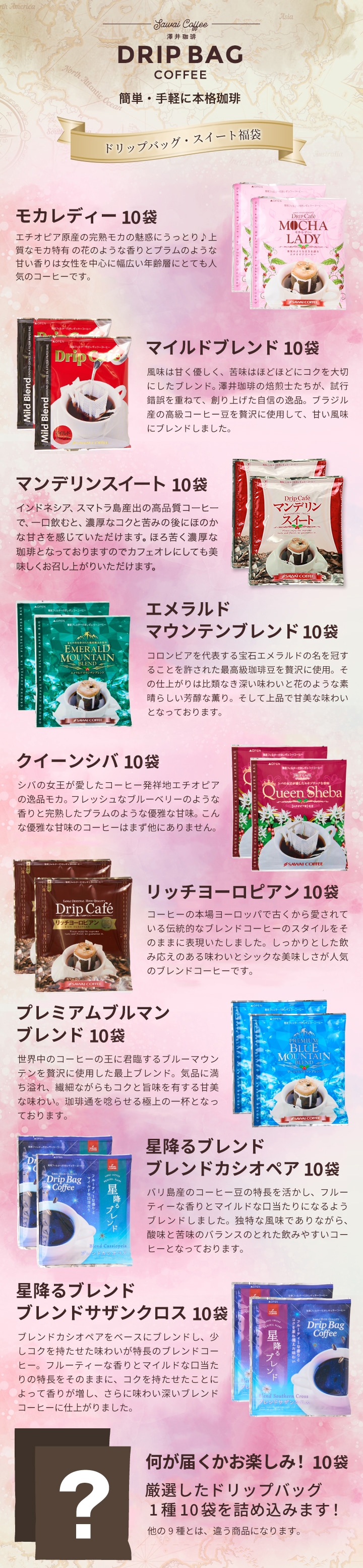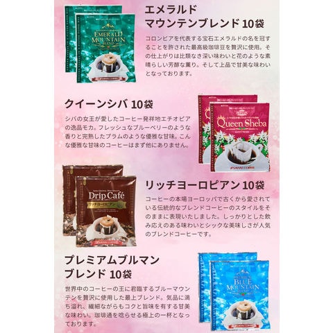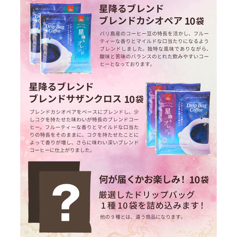 | 内容量 | 各8g×10袋 ・マイルドブレンド ・マンデリンスイート ・リッチヨーロピアン ・クイーンシバ ・モカレディ ・星降るブレンド ブレンドカシオペア ・星降るブレンド ブレンドサザンクロス ・エメラルドマウンテンブレンド ・プレミアムブルマンブレンド ・??? |