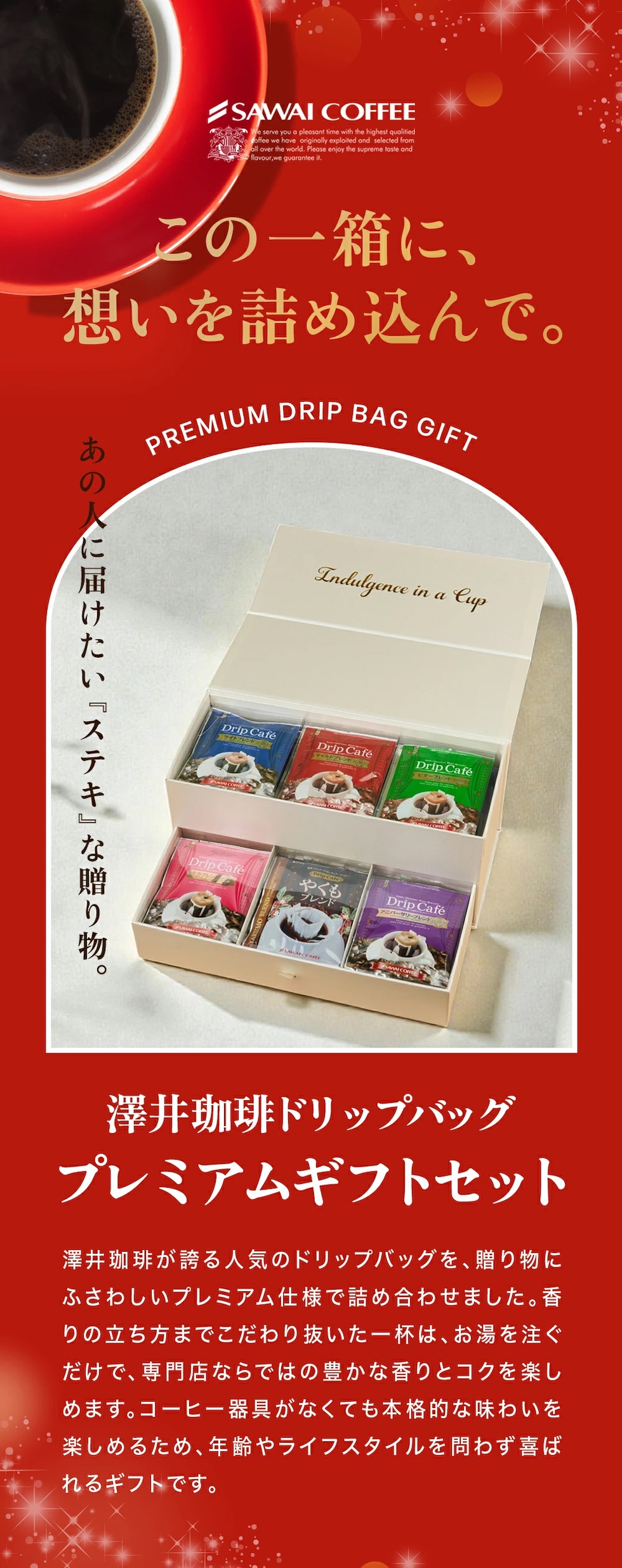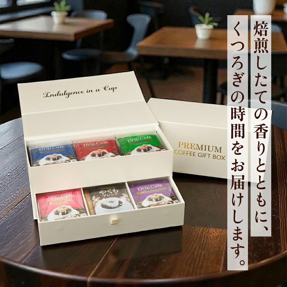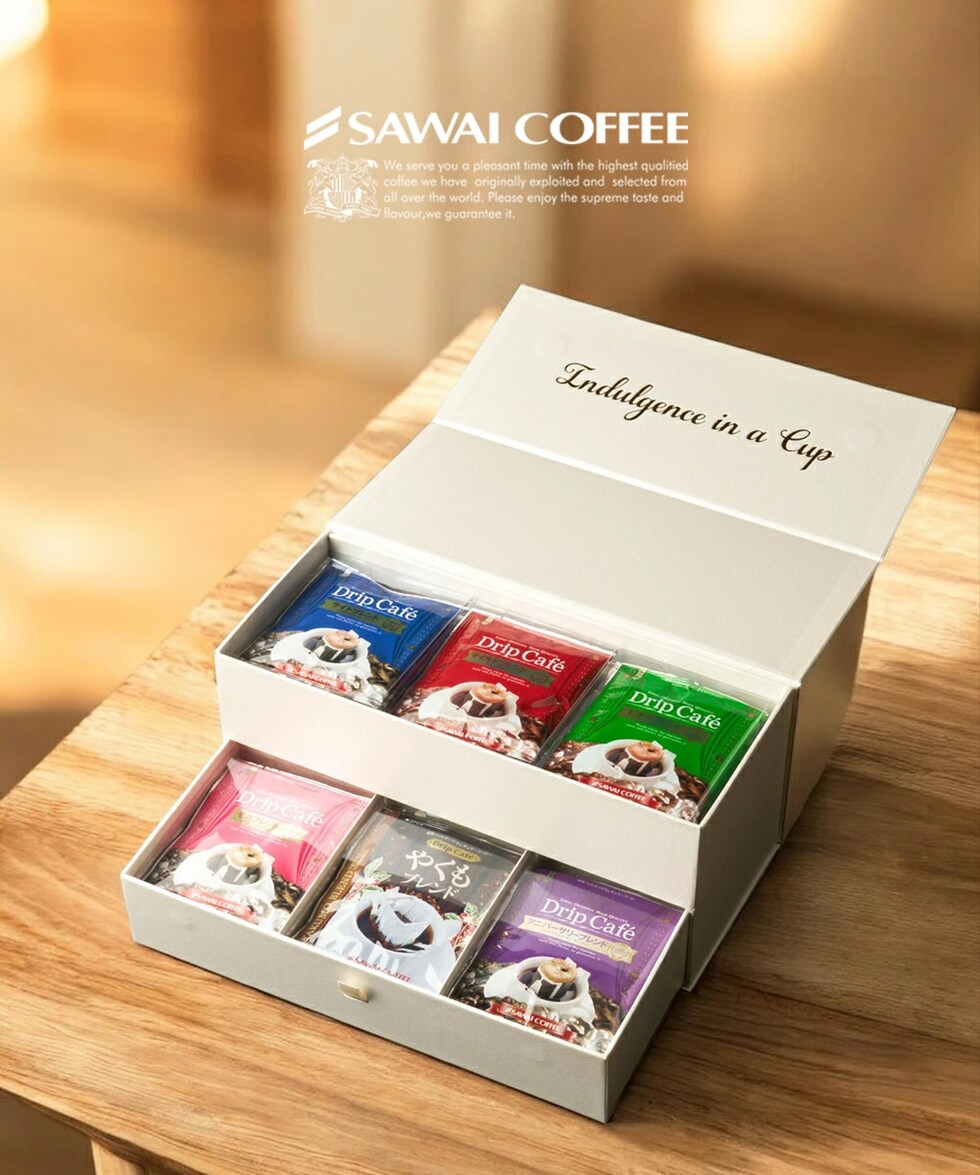 上質な香りと味わいを楽しめる6種類のドリップバッグコーヒーを、贅沢に詰め合わせた2段ギフトセットです。焙煎したての鮮度とこだわりのブレンドで、ご自宅でも手軽に本格的なカフェ気分を味わえ、大切な方への贈り物にも最適です。