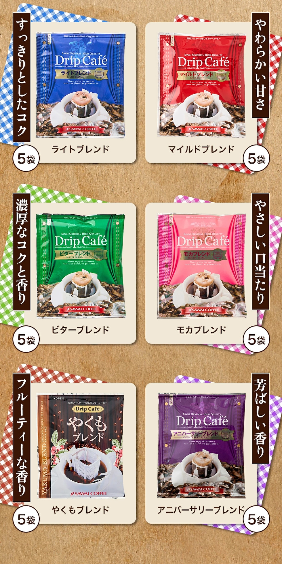 ドリップバッグコーヒー ・マイルドブレンド 8g×5袋 ・ライトブレンド 8g×5袋 ・ビターブレンド 8g×5袋 ・アニバーサリーブレンド 8g×5袋 ・やくもブレンド 8g×5袋 ・モカブレンド 8g×5袋 |