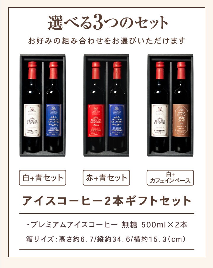 | セット内容 | 下記よりセット内容をご選択いただけます。 ●白+青セット ・プレミアムアイスコーヒー 無糖 500ml×1本(白ラベル) ・プレミアムアイスコーヒー ビターワイニー 無糖 500ml×1本(青ラベル) ●赤+青セット ・プレミアムアイスコーヒー ワイニー 無糖 500ml×1本(赤ラベル) ・プレミアムアイスコーヒー ビターワイニー 無糖 500ml×1本(青ラベル) ●白+カフェオレベース ・プレミアムアイスコーヒー 無糖 500ml×1本(白ラベル) ・プレミアムカフェオレベース 無糖 500ml×1本(希釈タイプ) |