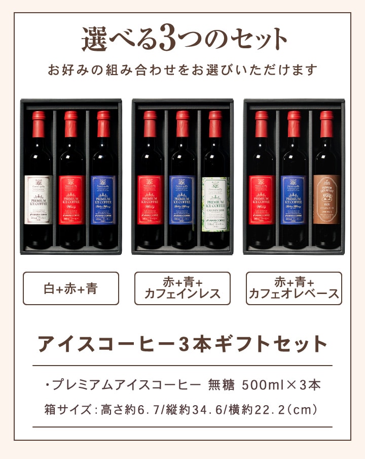 | セット内容 | 下記よりセット内容をご選択いただけます。 ●白+赤+青セット ・プレミアムアイスコーヒー 無糖 500ml×1本(白ラベル) ・プレミアムアイスコーヒー ワイニー 無糖 500ml×1本(赤ラベル) ・プレミアムアイスコーヒー ビターワイニー 無糖 500ml×1本(青ラベル) ●赤+青+カフェインレスセット ・プレミアムアイスコーヒー ワイニー 無糖 500ml×1本(赤ラベル) ・プレミアムアイスコーヒー ビターワイニー 無糖 500ml×1本(青ラベル) ・プレミアムアイスコーヒー カフェインレス 無糖 500ml×1本 ●赤+青+カフェオレベースセット ・プレミアムアイスコーヒー ワイニー 無糖 500ml×1本(赤ラベル) ・プレミアムアイスコーヒー ビターワイニー 無糖 500ml×1本(青ラベル) ・プレミアムカフェオレベース 無糖 500ml×1本(希釈タイプ) |