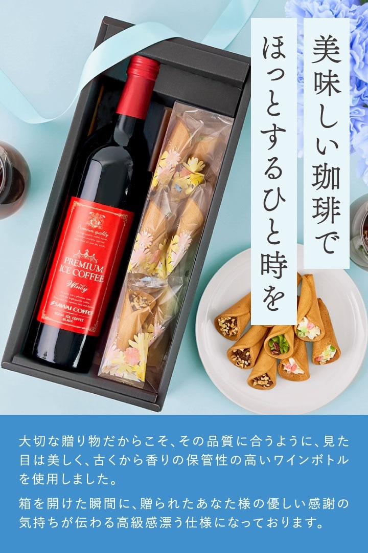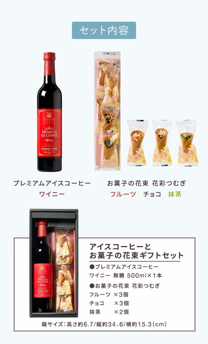 | このギフトは、香り高いプレミアムアイスコーヒーと、花束のような可愛いお菓子のセットです。贈り物にぴったりで、特別なカフェタイムを演出します。 1.特別なアイスコーヒーで贅沢なひとときを ワインのように香りが広がり、果実のような甘さと、すっきりとした後味が特徴です。さらに、無糖なので、自分好みに甘さを調整できるのもポイントです。 2.見た目も可愛い!食べられる花束のお菓子 フルーツは、レモン風味のバニラクリームに、イチゴ・マンゴー・キウイをのせた爽やかな味わい。チョコは、濃厚なチョコクリームとアーモンドが相性抜群。抹茶は、宇治抹茶のクリームに小豆を加え、和の風味を楽しめます。 3.贈り物に最適!高級感のあるギフトセット コーヒー好きの方や、大切な人へのプレゼントに最適。誕生日、記念日、お礼の品など、さまざまなシーンで活躍します。 |