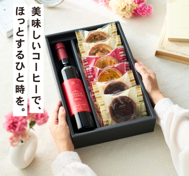 | こだわり抜いて作ったプレミアムアイスコーヒーと、タルトがセットになったギフトです。香り高いコーヒーと、それにぴったりなスイーツで、特別なカフェタイムを楽しめる商品です。 1.プレミアムアイスコーヒーで至福のひとときを ワイングラスに注ぐとふわっと広がる香りが特徴のプレミアムアイスコーヒーが含まれています。無糖でさっぱりとした味わいが楽しめるので、コーヒーの深い苦味とほんのりとした甘さがしっかり感じられます。高級感のあるワインボトル型のデザインも魅力で、贈り物にぴったりです。 2.コーヒーにぴったりの3種類のタルト コーヒーの味を引き立てる3種類のスイーツが入っています。チョコ感たっぷりの濃厚なチョコタルト、食べやすく見た目も華やかなオレンジタルト、ザクザク食感のナッツタルト。それぞれがコーヒーとの相性抜群で、甘さ控えめなので大人にも喜ばれる味わいです。どれも口の中で優しく広がる香りと味わいが、コーヒータイムをより一層楽しませてくれます。 3.贈り物に最適なシンプルで高級感あるパッケージ シンプルながらも高級感のある箱に収められています。プレゼントとしてそのまま渡せるように、ラッピングと手提げ袋も付いており、ギフトとしての準備が整っています。大切な方への感謝の気持ちを伝える贈り物として、特別なシーンで活躍すること間違いありません。 |