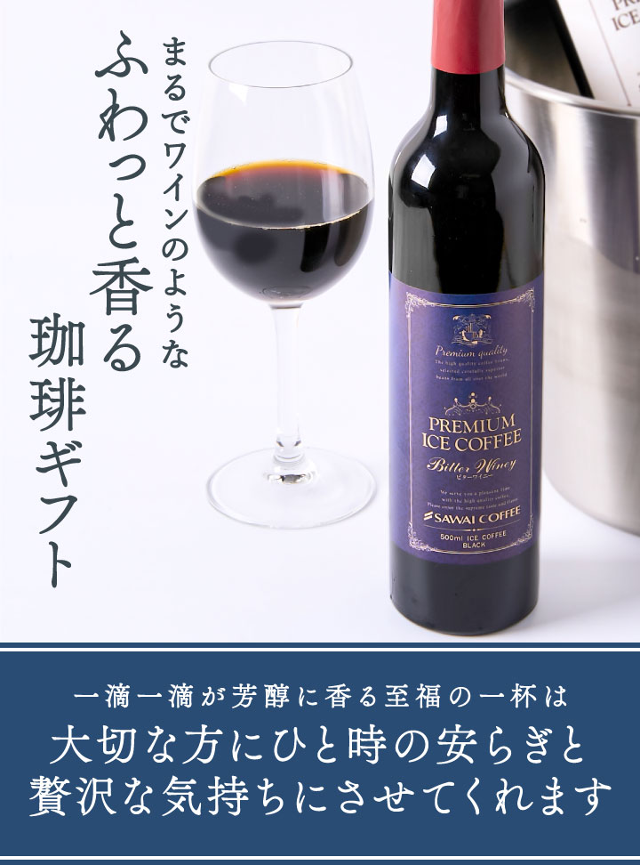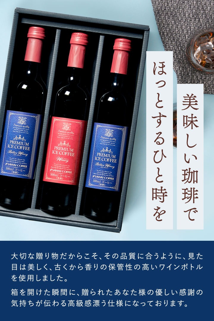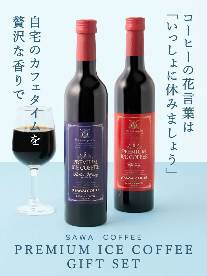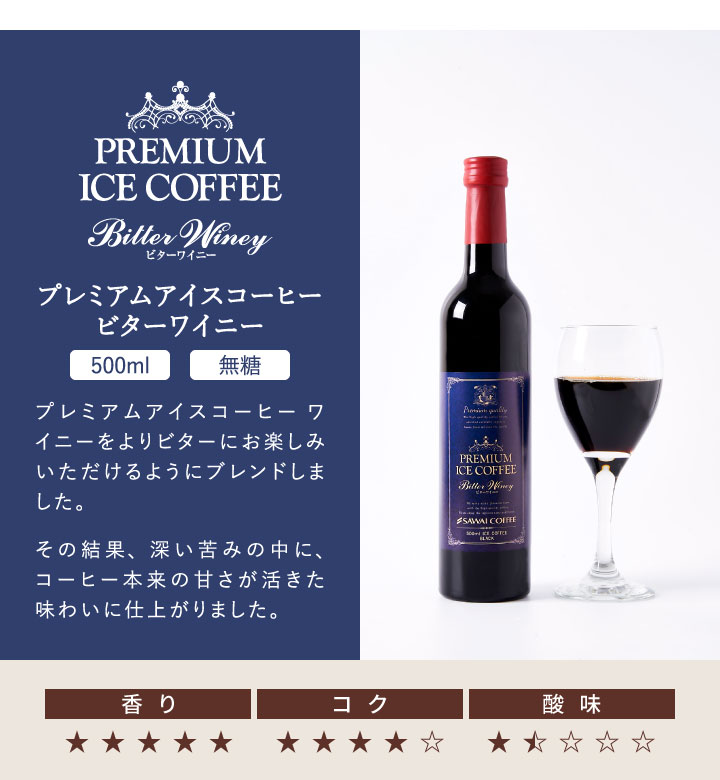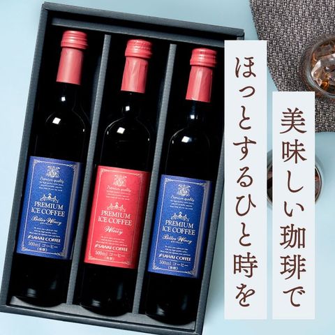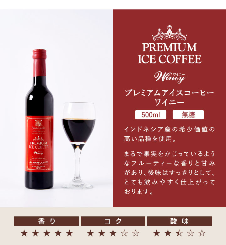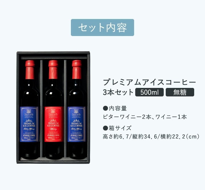 | 内容量 | ・プレミアムアイスコーヒー ワイニー 500ml×1本(赤ラベル) ・プレミアムアイスコーヒー ビターワイニー500ml×2本(青ラベル) |