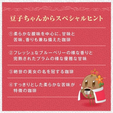 驚きと満足が詰まった、珈琲の女王の福袋!この福袋には、4種類の女王の名に相応しい気品のあるコーヒーが詰まっています。柔らかな酸味を中心に、甘味と苦味、香りも兼ね備えた珈琲。フレッシュなブルーベリーの様な香りと完熟されたプラムのような優雅な甘味。絶世の美女の名を冠する珈琲。すっきりとした柔らかな苦味が特徴の珈琲など、どれも特別な味わい。合計800gのボリュームで約80杯分楽しめます。中身は届いてからのお楽しみだから、開けるワクワク感も魅力。送料無料で、コスパも抜群です! 1.どんな味が届くかはお楽しみ!開けるワクワク感 この福袋の最大の特徴は、「中身は届くまでのお楽しみ!」という点。4種類のレギュラーコーヒーが入っていますが、どれが入っているかは開けてからのお楽しみ。コーヒー好きなら、このワクワク感がたまりません。毎日のコーヒータイムを新鮮な気持ちで迎えられ、まるで特別なギフトを受け取ったような気分に。自分用はもちろん、コーヒー好きな家族や友人へのプレゼントにもおすすめです! 2.80杯分!たっぷり楽しめる大容量 この福袋には、200gの珈琲が4種類入っており、合計800gの大ボリューム。約80杯分楽しめるので、毎日のコーヒータイムにぴったり。家族みんなで飲む方や、職場や来客用にストックしておきたい方にも最適です。 3.女王の名に相応しい珈琲をたっぷり詰め込んだ贅沢なセット この福袋に入っているのは、厳選された4種類のレギュラーコーヒー。女王の名に相応しい気品のあるコーヒー4種を選んでお届けします。普段なかなか飲めない特別な味わいを、家で気軽に楽しめます。いつもと違うコーヒーを試したい方、特別な時間を過ごしたい方にぴったりのセットです! |