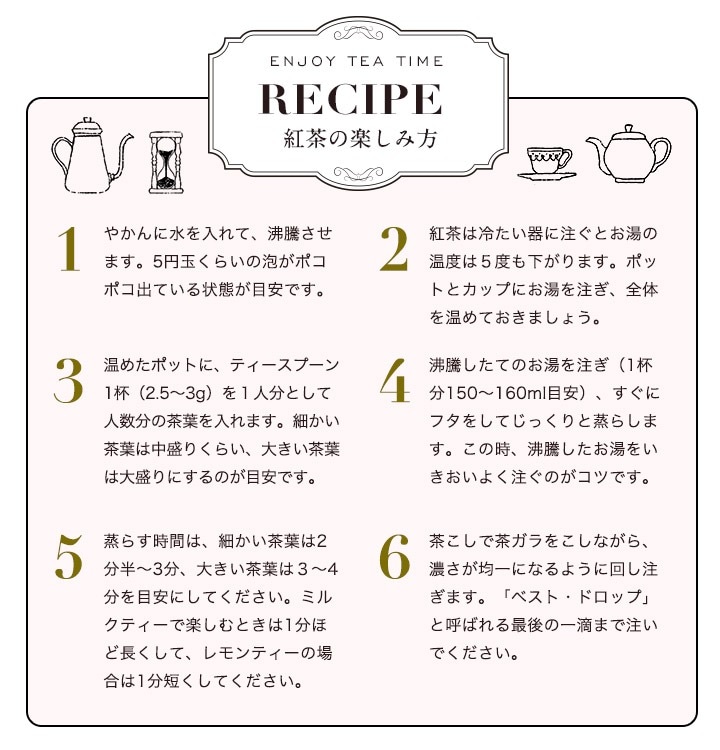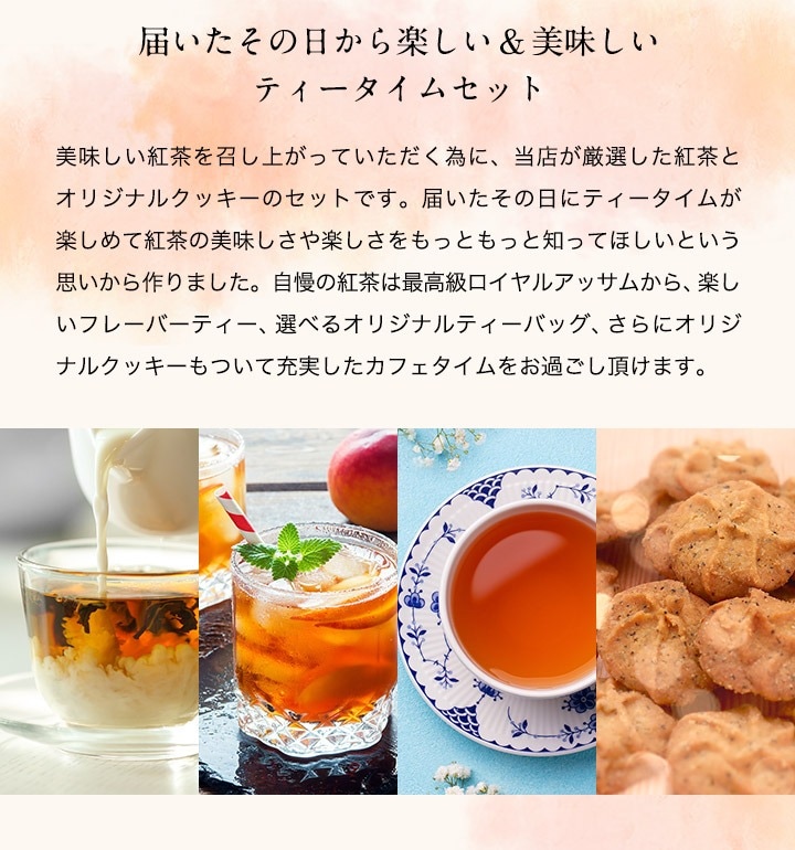 | 保存方法 | 紅茶は、高温多湿の場所や冷蔵庫・冷凍庫は避けて、直接日の当たらない涼しい場所(カップボードの中など)で保管して下さいませ。クッキーは冷蔵庫に入れて保管してください。 |