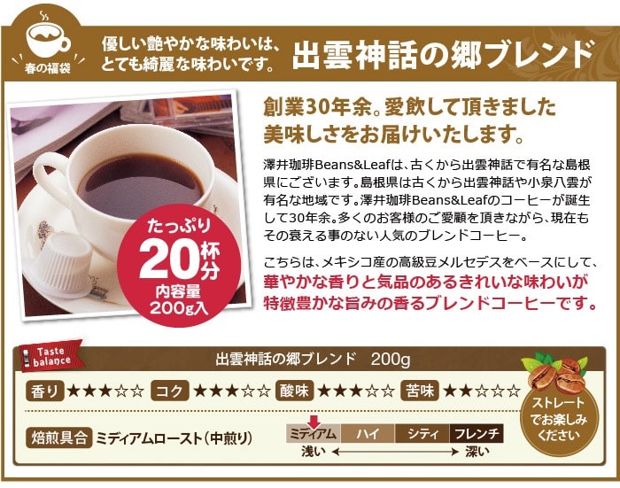 | 内容量 | ●レギュラーコーヒー ・出雲神話の郷ブレンド 200g ・スプリングブレンド 200g ●桜の紅茶シフォンケーキ(12cm)×1個 ●さくらの紅茶ティーバッグ×5個 |