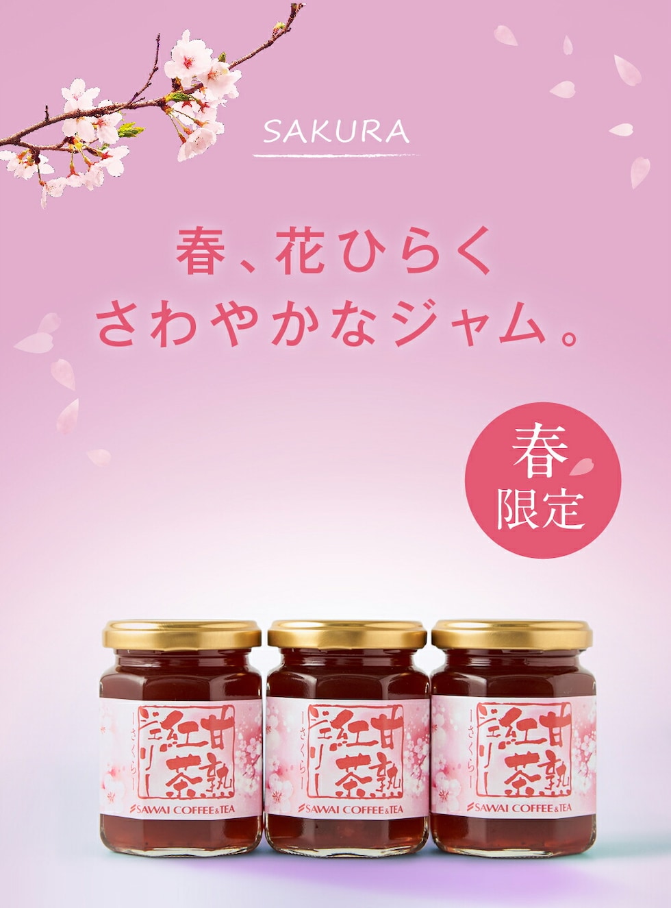 | 原材料 | 紅茶抽出液、グラニュー糖、桜加工品(桜ペースト(桜花塩漬、砂糖、桜葉塩漬)、砂糖、水あめ)、食酢(梅酢)、レモン汁(濃縮還元)、桜花シロップ漬(砂糖、桜花塩漬、梅酢)/ペクチン、クチナシ色素、アカキャベツ色素(一部にリンゴを含む) |