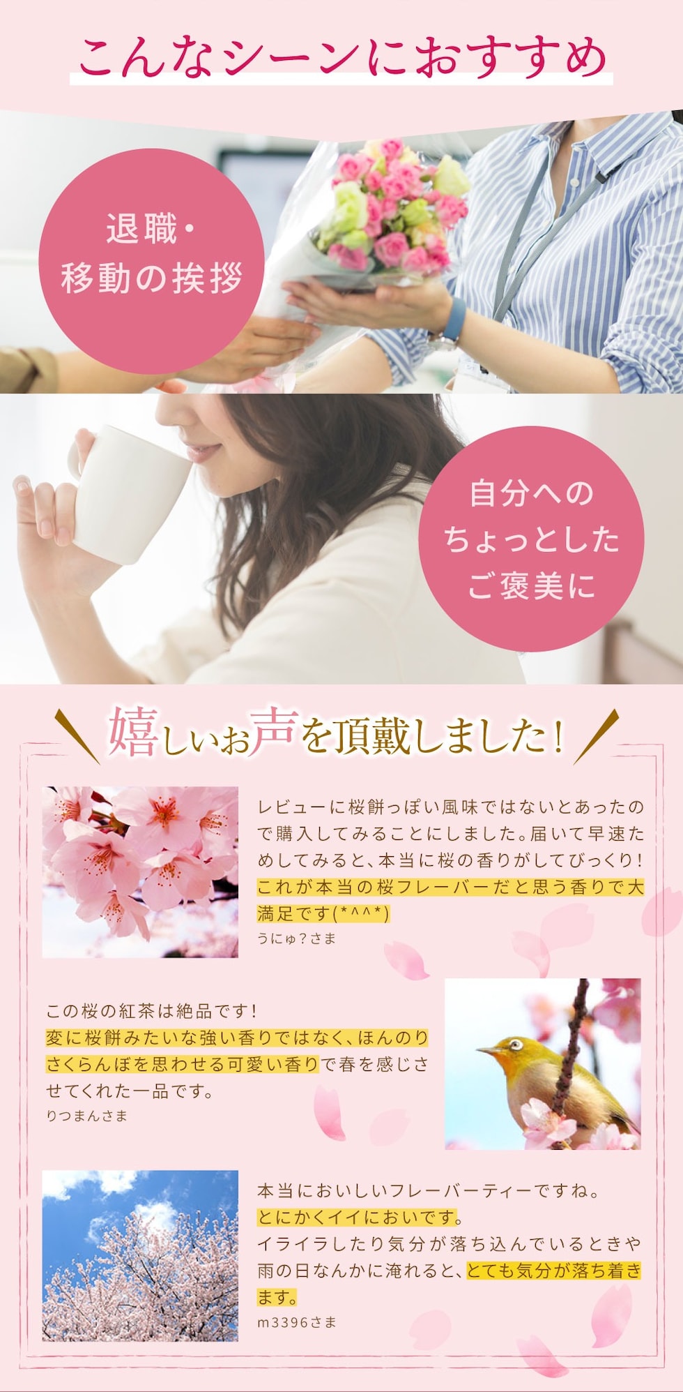 | こんな方にオススメです | 春の贈り物として最適: 多卒業や入学、退職の挨拶などにぴったりなギフトです。桜の香りと優しいデザインが、贈られる方に春らしい温かみを届けます。 大切な人への季節感あるプレゼントに:春の訪れを感じられるこの商品は、家族や友人へのプレゼントに最適です。 自分へのご褒美タイムにぴったり手作りクッキーと簡単に楽しめる紅茶が、忙しい日常に春の癒しをプラス。自宅で気軽に季節の香りを楽しめます。 |