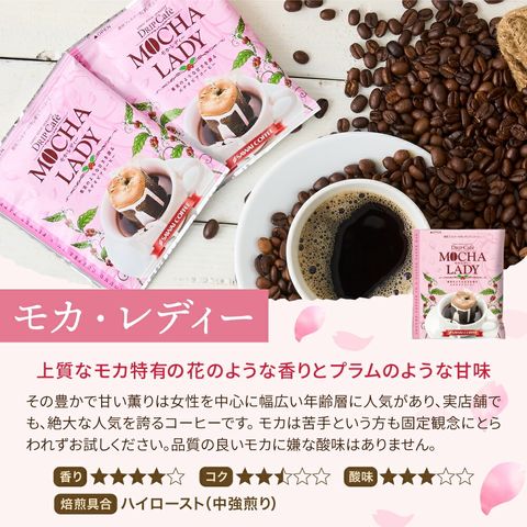 ●ドリップバッグ ・モカレディ 8g×1袋 ・モカブレンド 8g×1袋 ・マンデリンスイート 8g×1袋 ●ガトープルポ カフェモカ/いちご/抹茶/レモンのうち1個 ※種類は選べません |