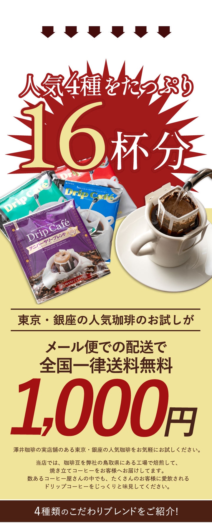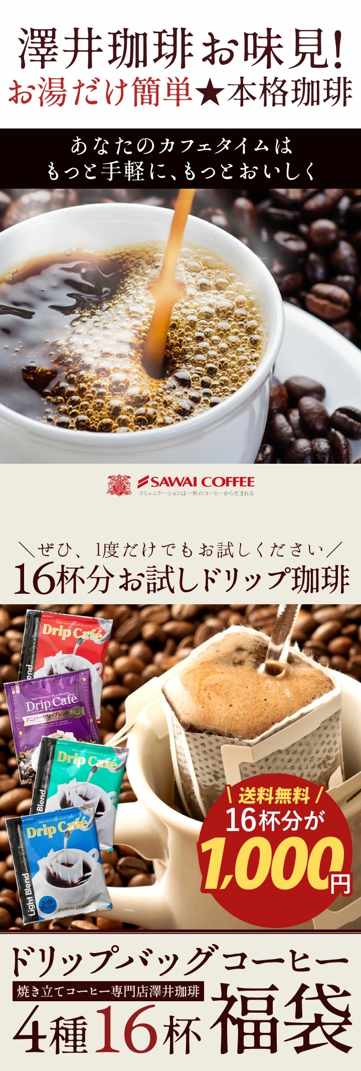 送料無料 1000円ポッキリ ドリップバッグ コーヒー 珈琲 "味の違いを楽しめる4種類のアソートドリップパック " 澤井珈琲 ドリップコーヒー 飲み比べ ライト・マイルド・ビター・アニバーサリー