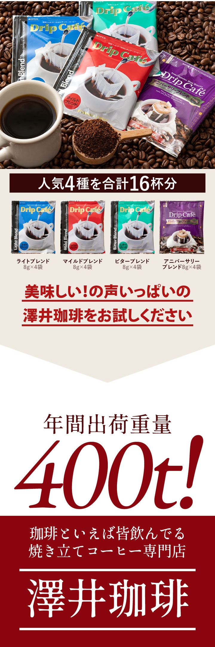 | 内容量 | ●ドリップバッグコーヒー ・ライトブレンド 8g×4袋 ・マイルドブレンド 8g×4袋 ・ビターブレンド 8g×4袋 ・アニバーサリーブレンド 8g×4袋 |