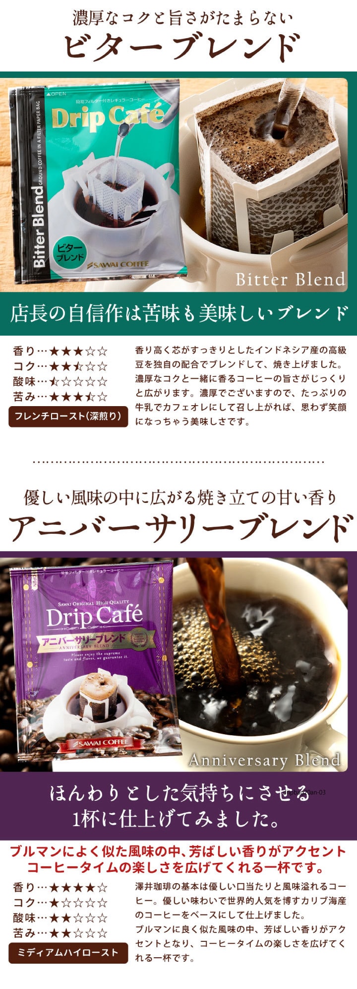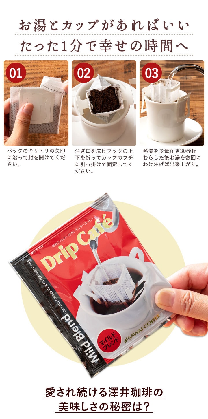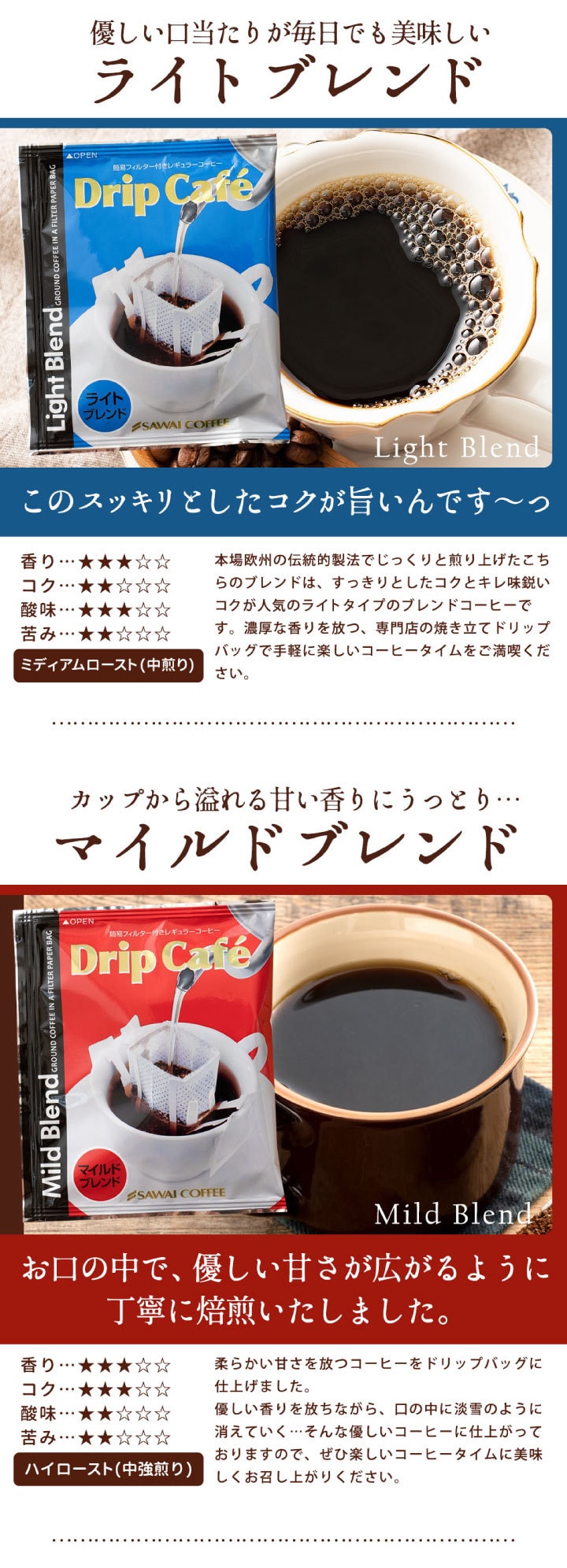 | 澤井珈琲のドリップカフェシリーズは、それぞれのブレンドが持つ独自の香りや味わいを手軽に楽しめるコーヒーです。香り高く、コク深く、毎日のコーヒータイムを特別なひとときに変えてくれます。 1. 優しい口当たりが毎日でも美味しい ライトブレンド 本場、欧州の伝統的製法でじっくりと煎り上げたこちらのブレンドは、すっきりとしたコクとキレ味鋭いコクが人気のブレンドコーヒーです。 2. 溢れる甘い香りにうっとり… マイルドブレンド 柔らかい甘さを放つコーヒーをドリップバッグに仕上げました。優しい香りを放ちながら、口の中に淡雪のように消えていく…そんな優しいコーヒーに仕上がっております。 3. 濃厚なコクと旨さがたまんない!! ビターブレンド 香り高く、芯がすっきりとしたインドネシア産の高級豆を独自の配合でブレンドして、焼き上げました。濃厚なコクと一緒に香るコーヒーの旨さが、じっくりと、じっくりと広がります。 4.優しい風味の中に広がる焼き立ての香り アニバーサリーブレンド ブルマンに良く似た風味の中、芳ばしい香りがアクセントとなり、コーヒータイムの楽しさを広げてくれる一杯です。 |