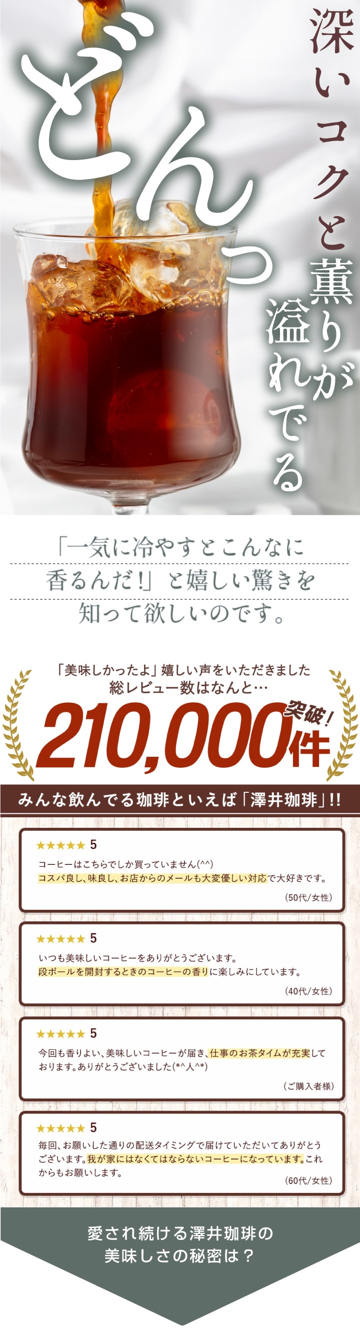 1.たっぷり楽しめる1.2kg!毎日飲んでも飽きない本格アイスコーヒー たっぷり3袋・合計1.2kg入りの大容量セットで、約120杯分のアイスコーヒーが楽しめます。澤井珈琲独自の焙煎で、冷たくしても深いコクと香りがしっかり感じられ、毎日飲んでも飽きない味に仕上がっています。忙しい朝や仕事の合間、リラックスタイムにもぴったり。コスパ抜群で家族みんなで楽しめる嬉しい内容です。 2.香りを引き出す技術と鮮度管理で、冷たいのに香る! 豆の鮮度にこだわり、注文後に焙煎・即発送されるから、袋を開けた瞬間に広がる香ばしい香りが魅力。さらに、新世代焙煎機によって丁寧に焼き上げることで、アイスにしてもコクと香りが引き立ちます。香りを逃さないパッケージで保管性も安心。冷たい飲み物でも「香り」を楽しみたい方におすすめの逸品です。 3.信頼と満足にこだわった品質管理で、初めての方にもおすすめ 製造から包装・出荷まで、すべての工程に細やかな管理が行き届いており、初めての方でも安心して試せます。もしもの時にも返品保証があり、好みに合うか不安な方、コーヒー選びで失敗したくない方にぴったりです。 |