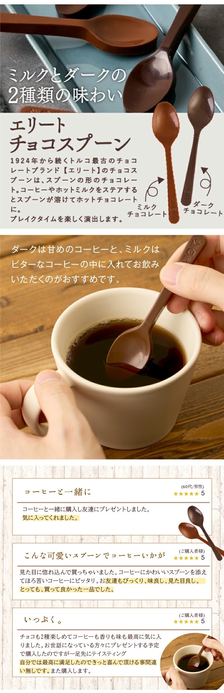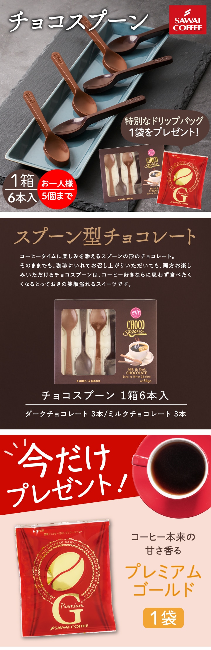 | 内容量 | ●エリート チョコスプーン 1箱6本入 ●ドリップバッグコーヒー プレミアムゴールド 8g×1袋 |