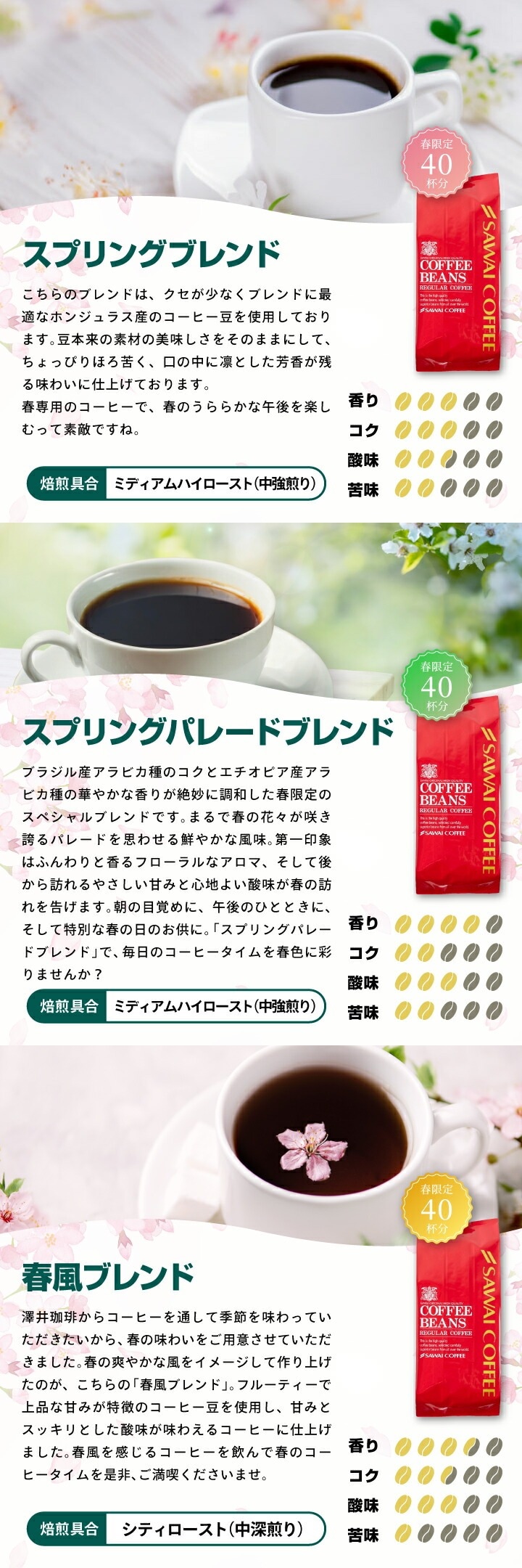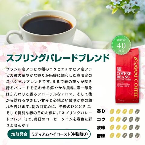・スプリングブレンド 400g×1袋 ・スプリングパレードブレンド 400g×1袋 ・春風ブレンド 400g×1袋 |