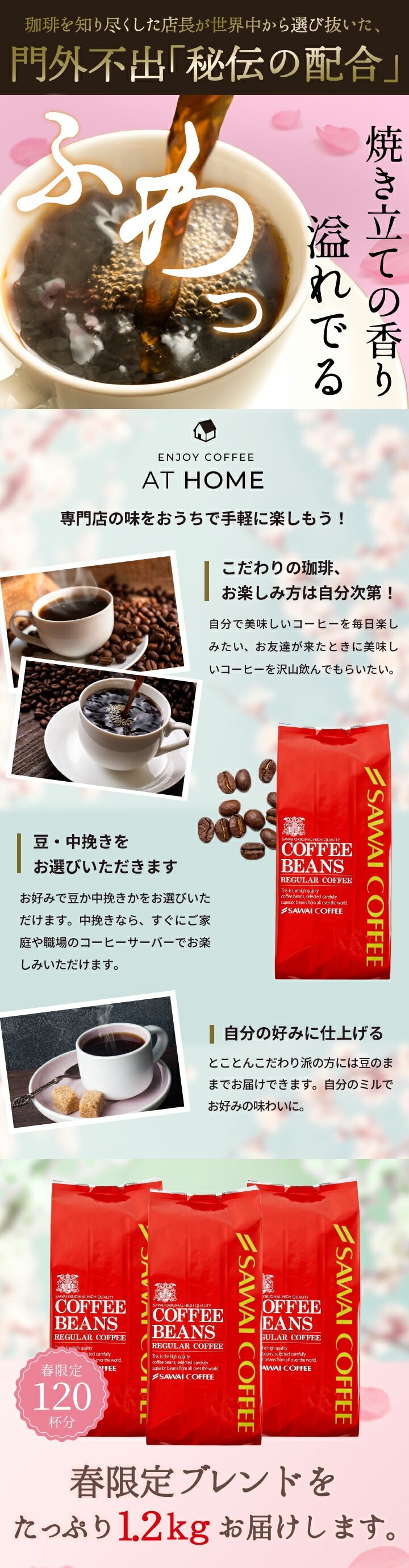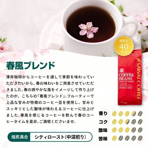 春の訪れを感じる限定ブレンド3種が各400gずつ、合計120杯分楽しめます。忙しい新生活のひとときに、専門店の春限定ブレンドで心を癒してみませんか?